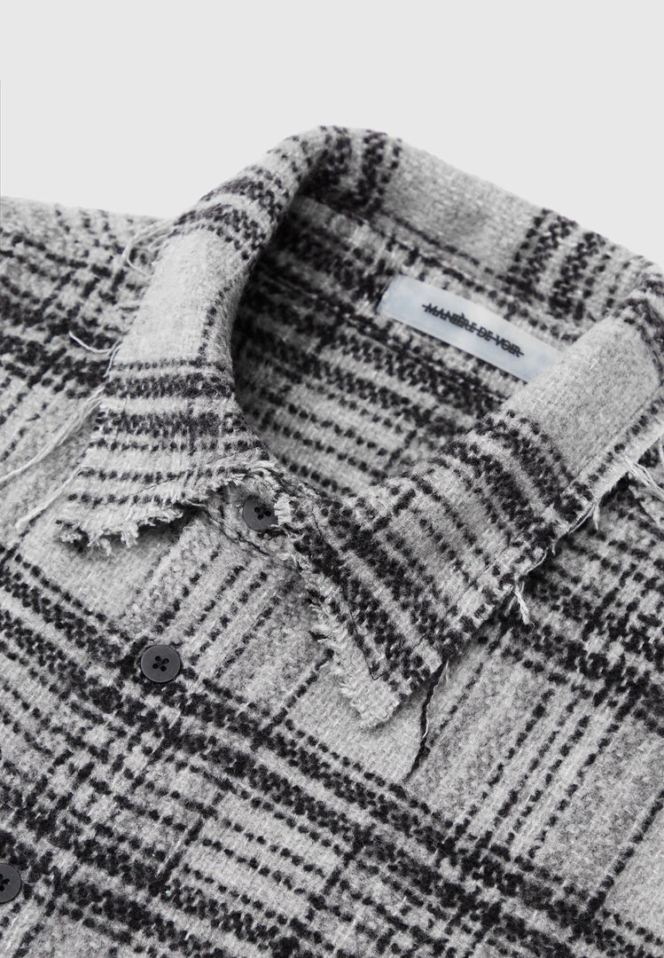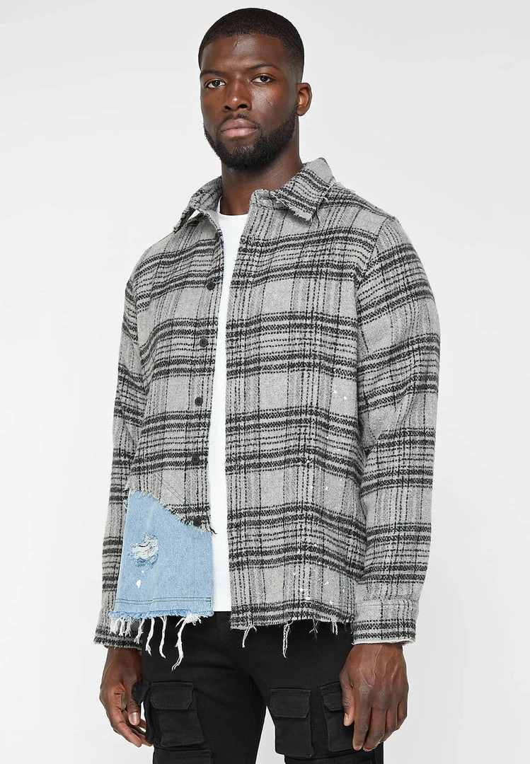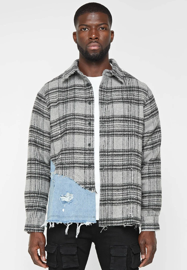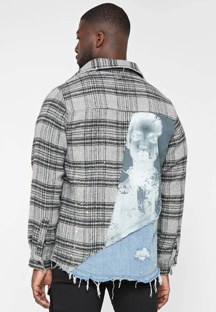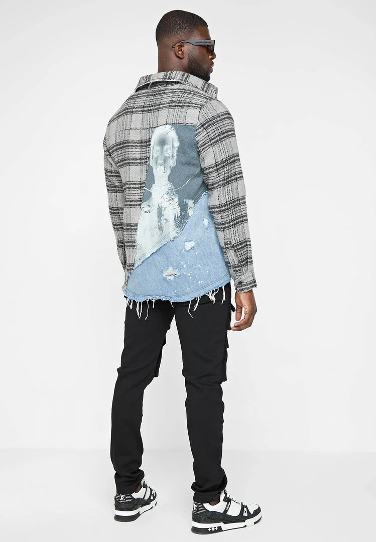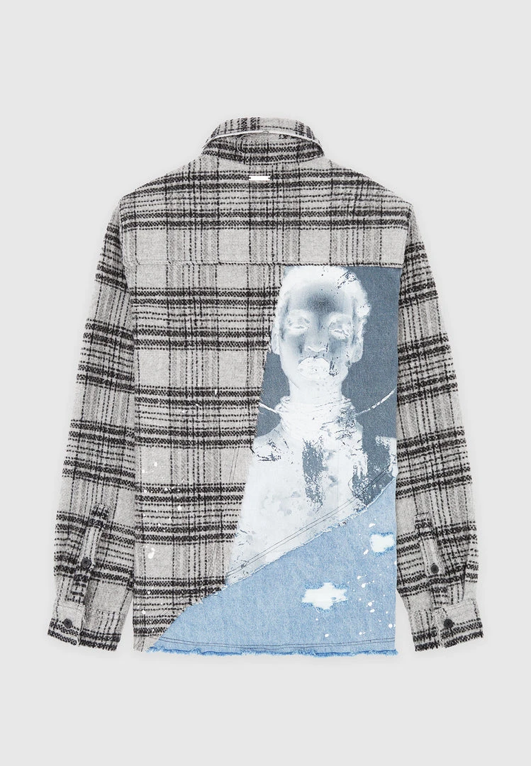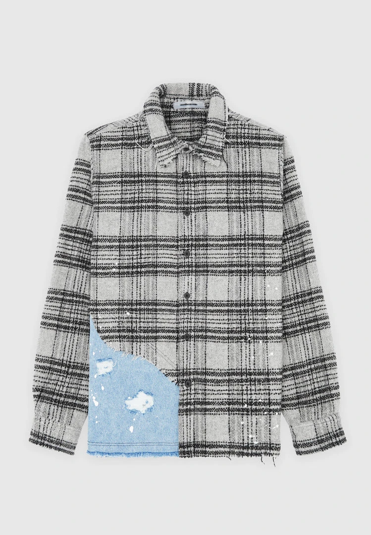 Mixed Check and Denim Shirt with Paint Splatter and Graphic Detail
