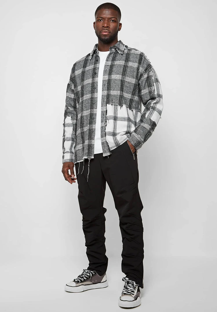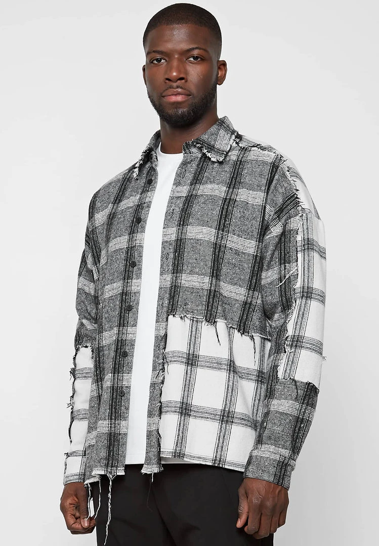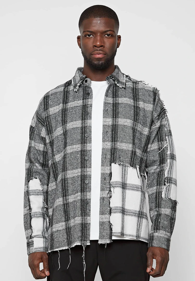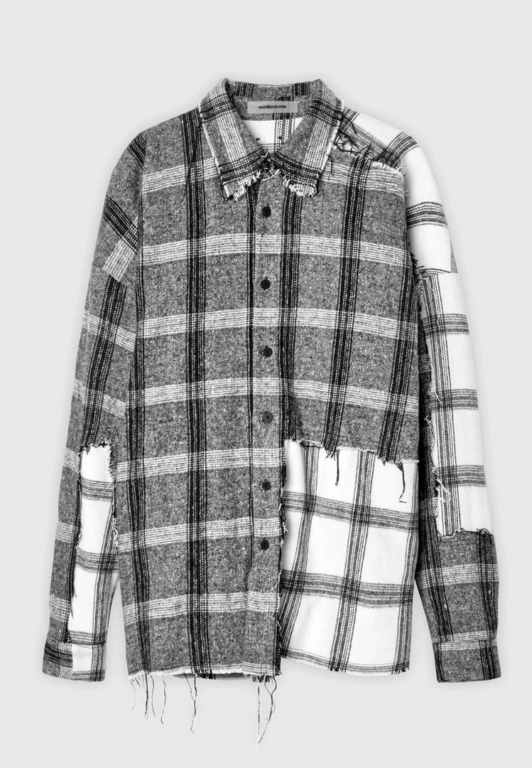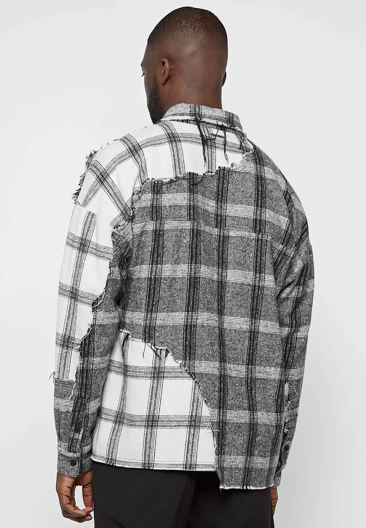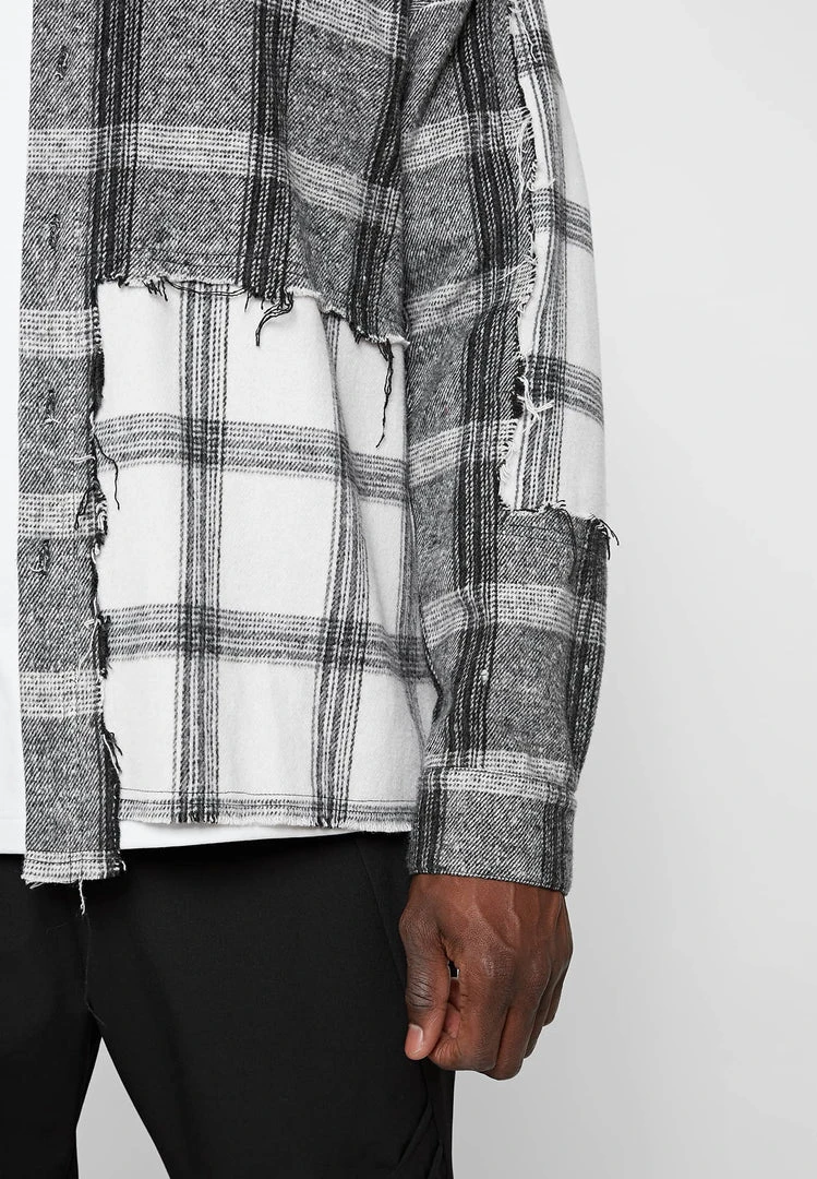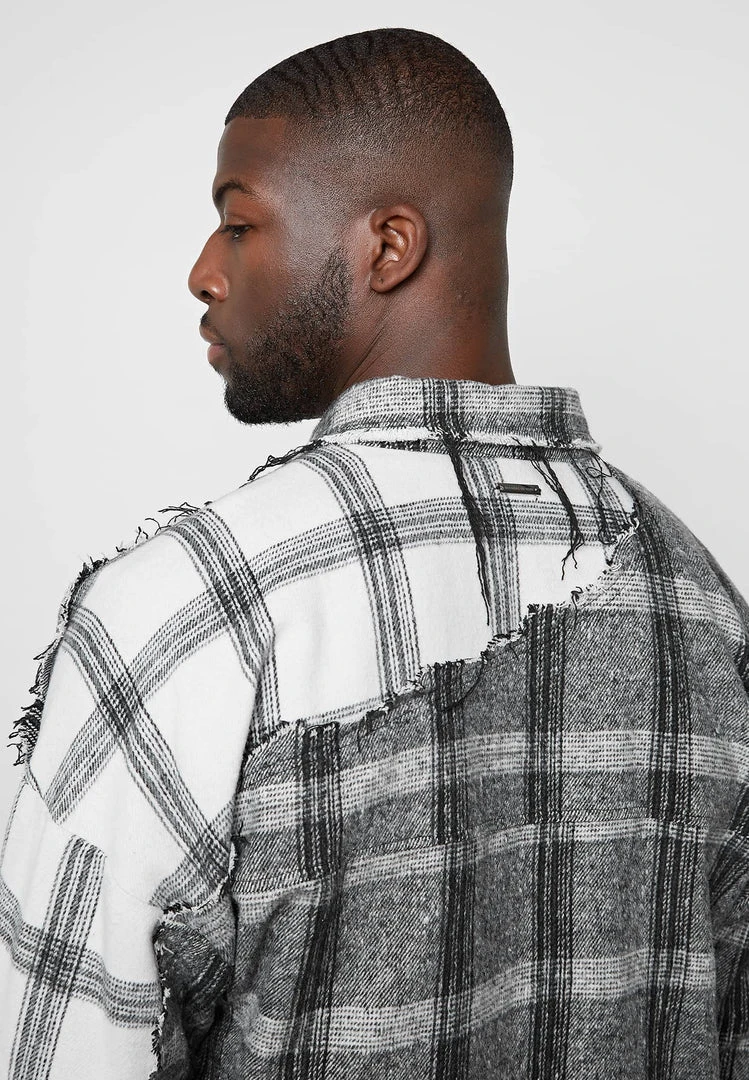 Distressed Mixed Check Loose Fit Shirt in Grey with Off-White