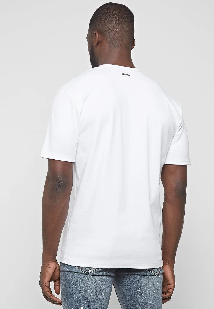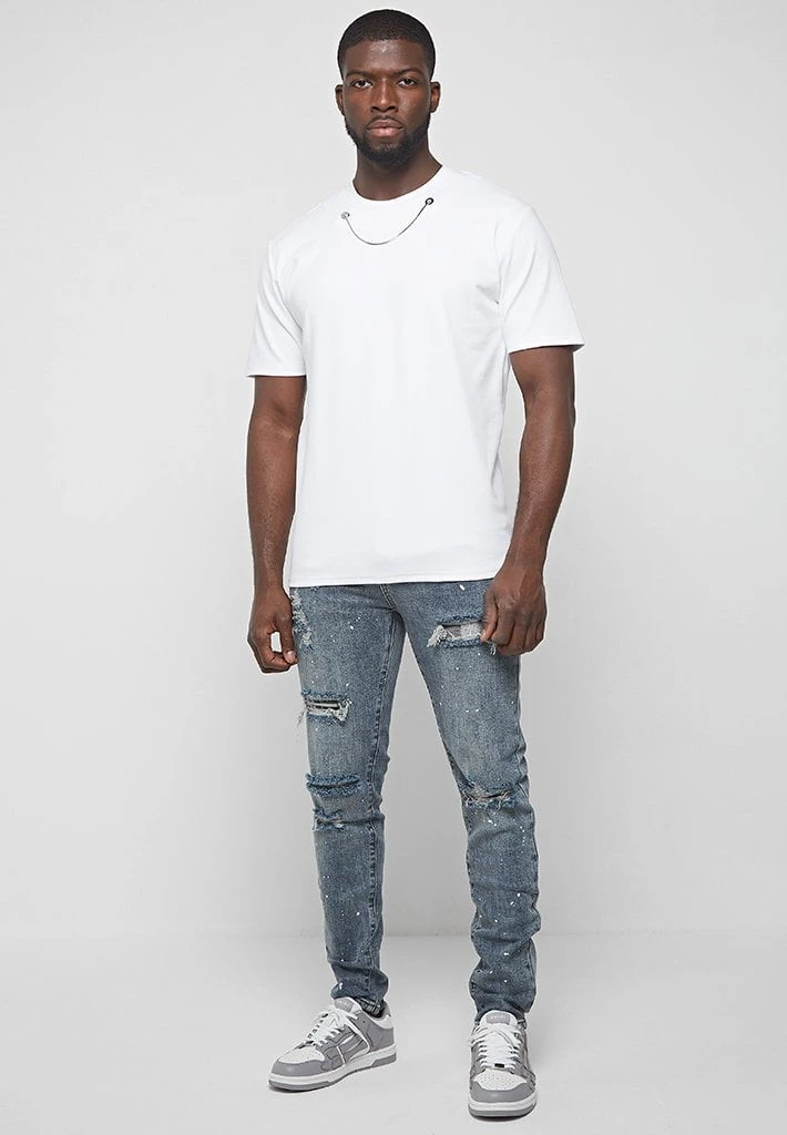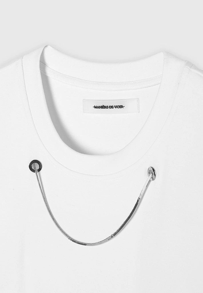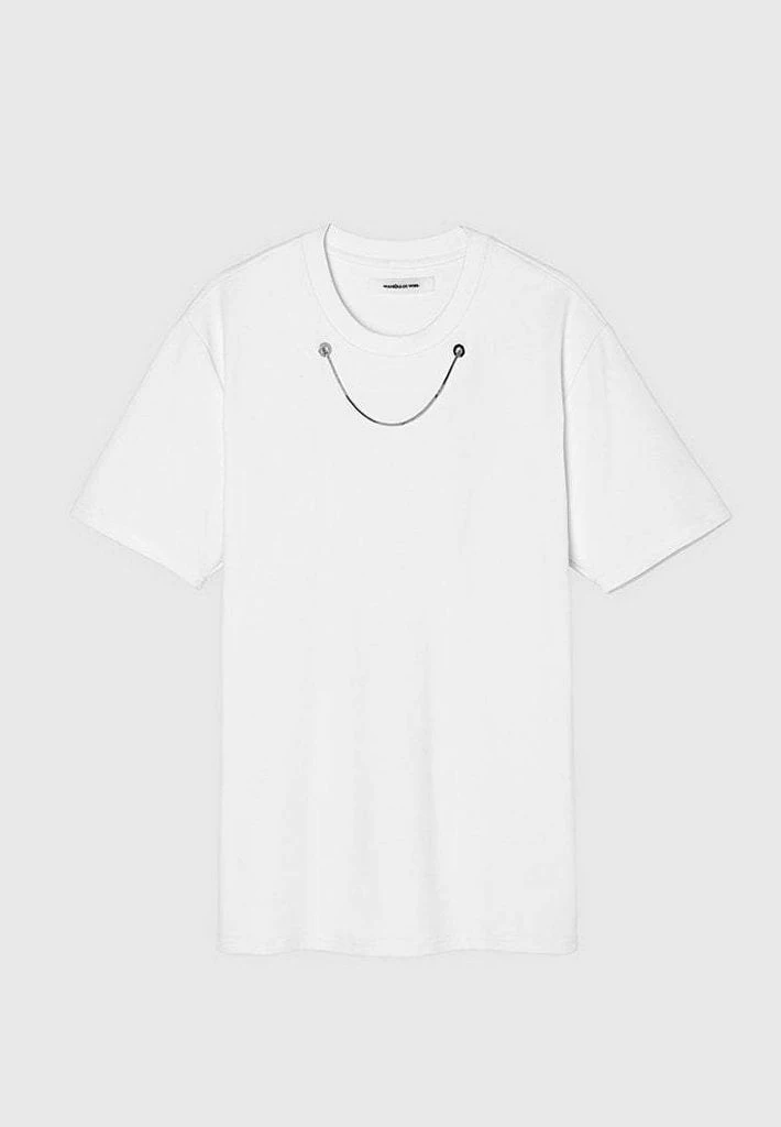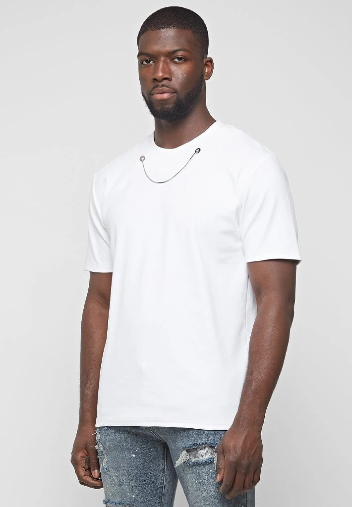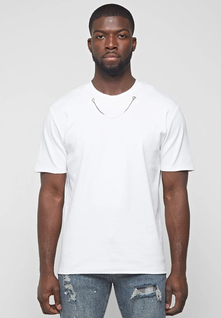White Regular Fit T-Shirt with Snake Chain Detail to Neck