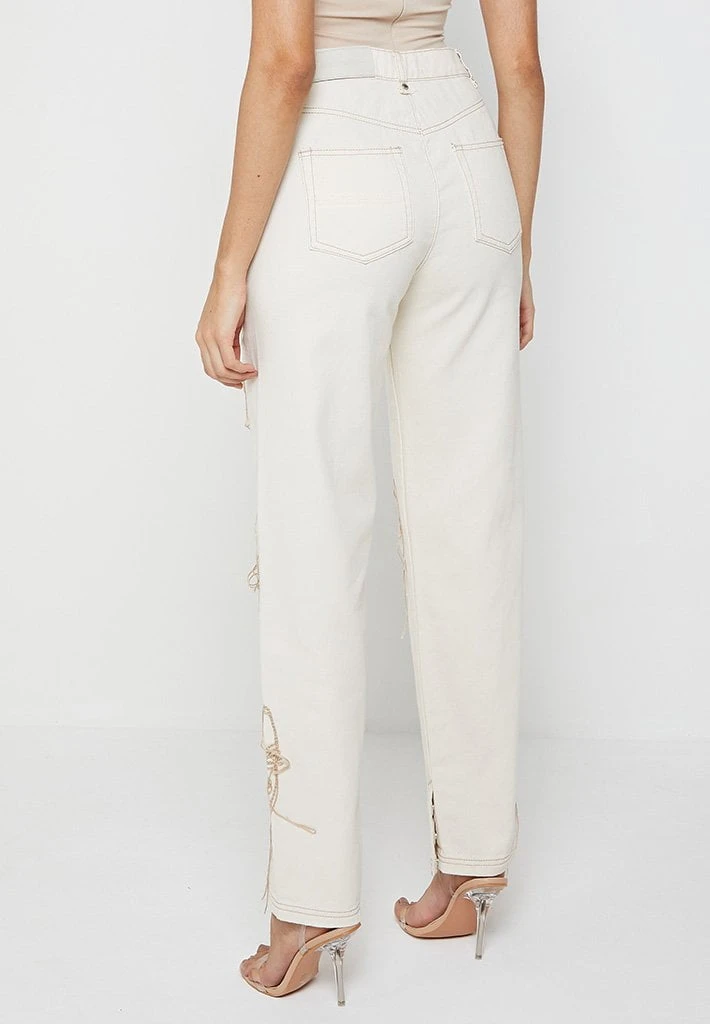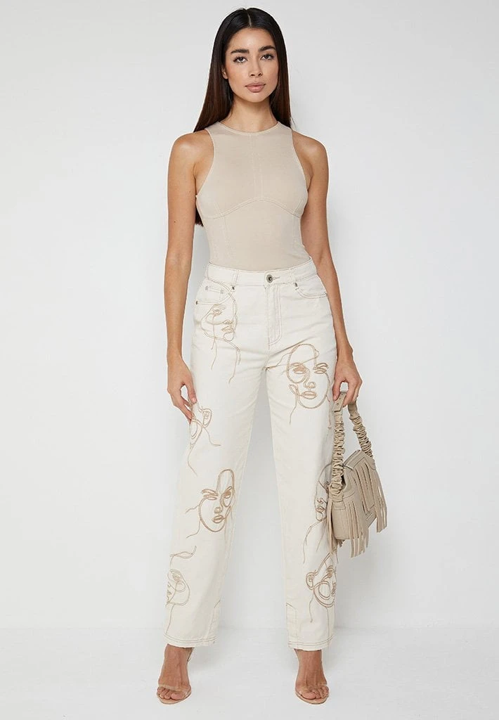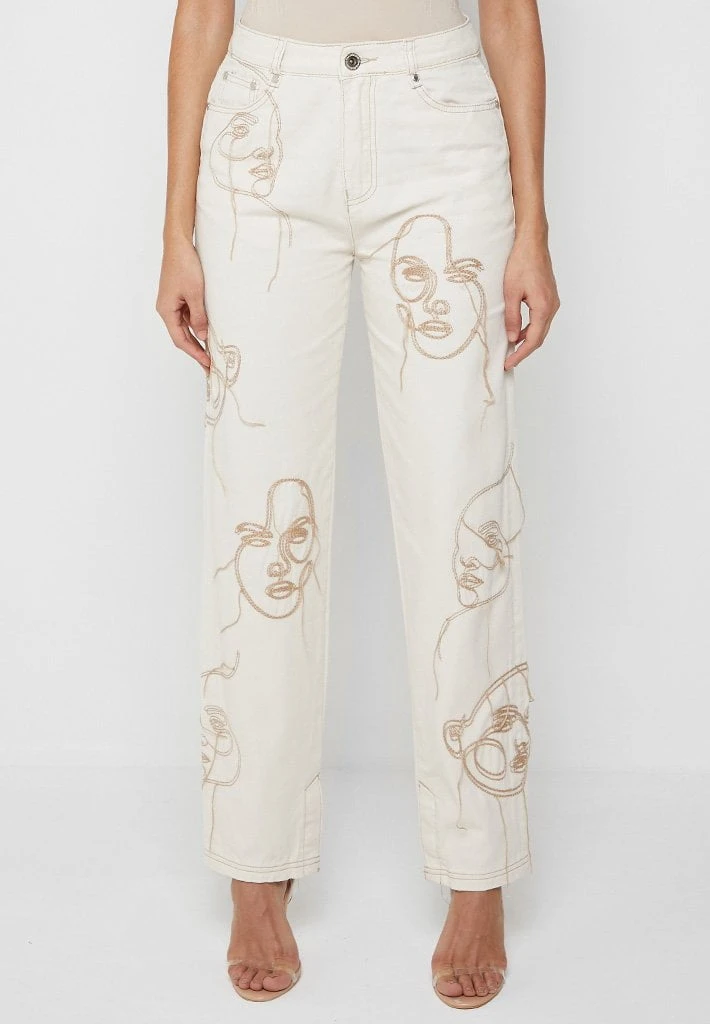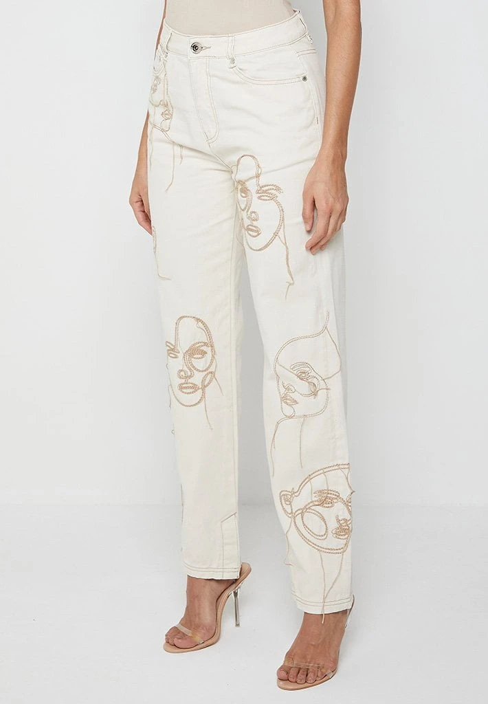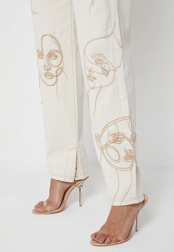 The Line Art Mom Jeans feature a statement design with multiple embroidered Line Art Faces and loose thread detailing. In our classic mom fit, they can be dressed up or down. These jeans also feature an internal adjustable waistband allowing for you to have a discretely customised fit.