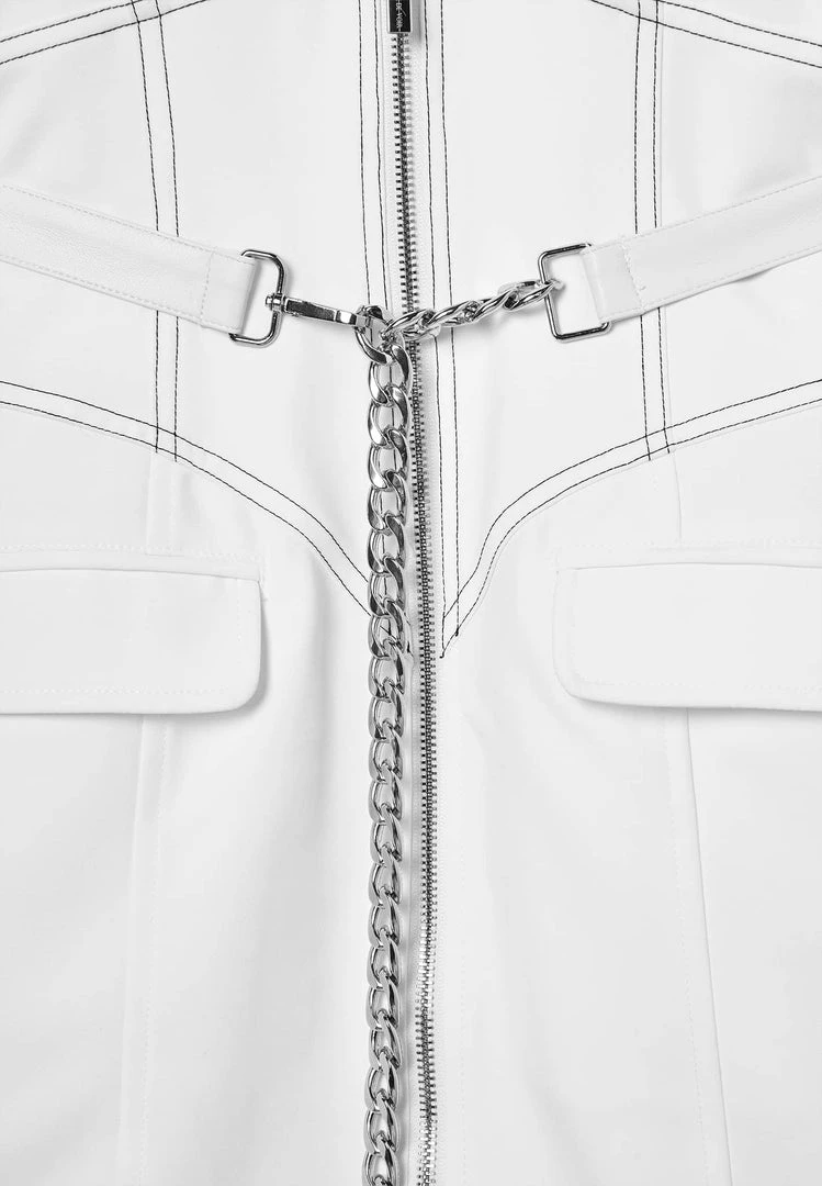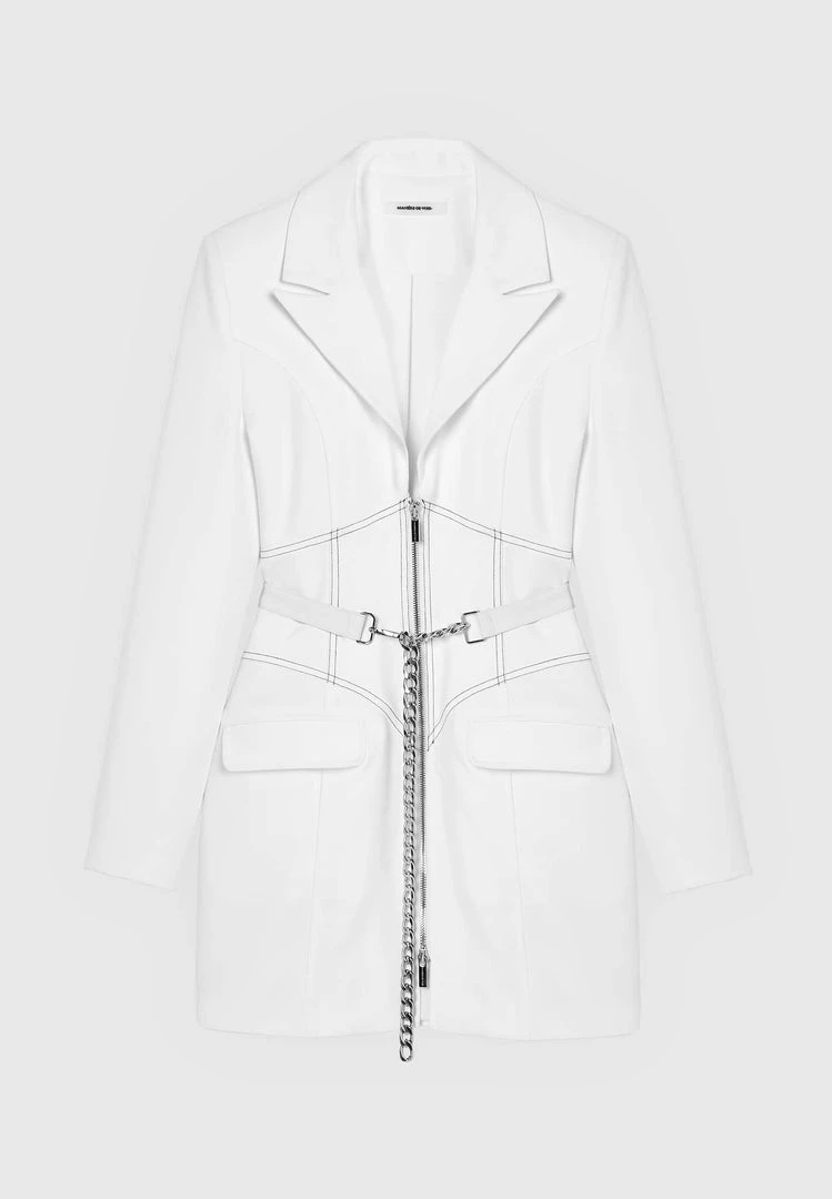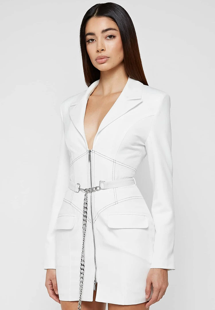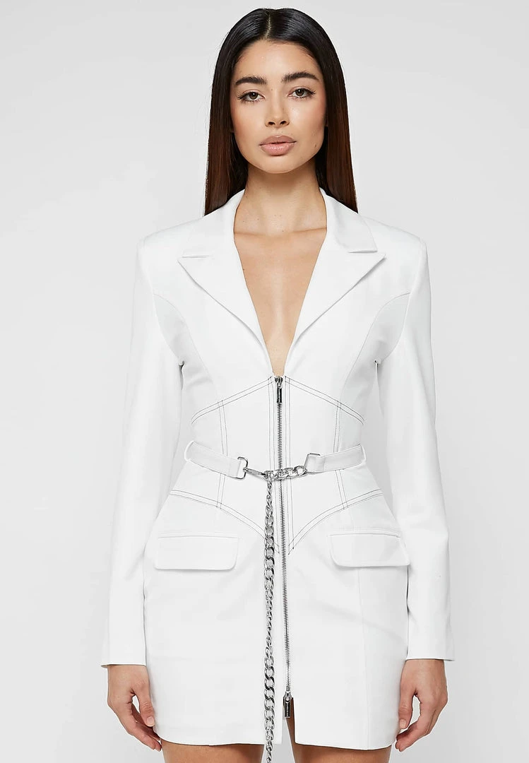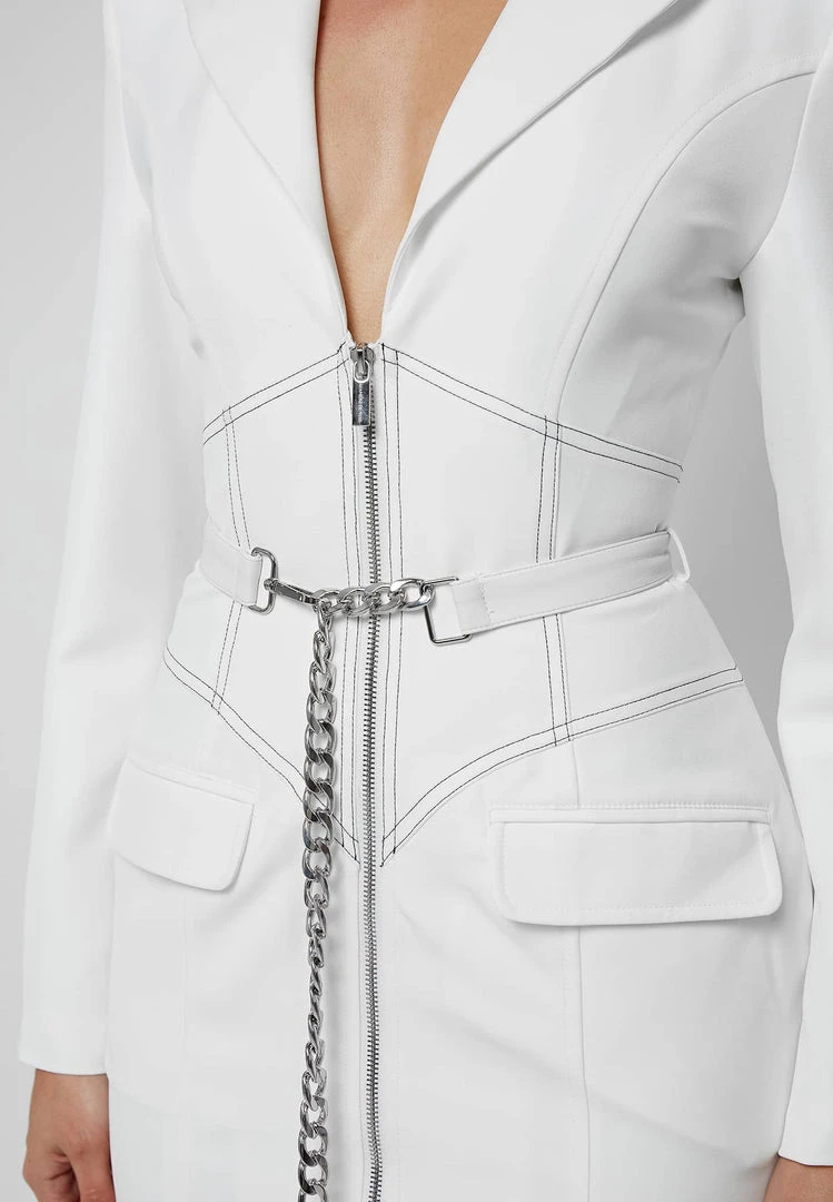 With the contrast stitching corset, this blazer dress contours the and accentuates the silhouette. The heavyweight silver curb chain is held with vegan leather belts that further accentuating the flattering illusion. Crafted from premium woven fabric, this dress has been made as a long life staple in all wardrobes.