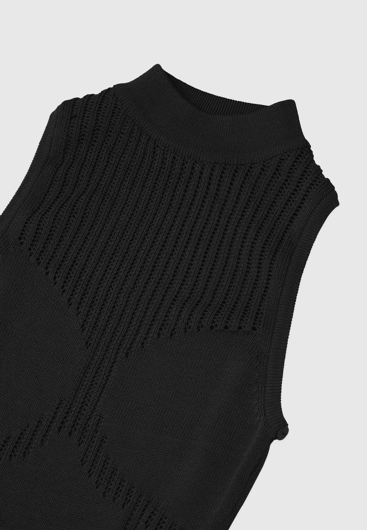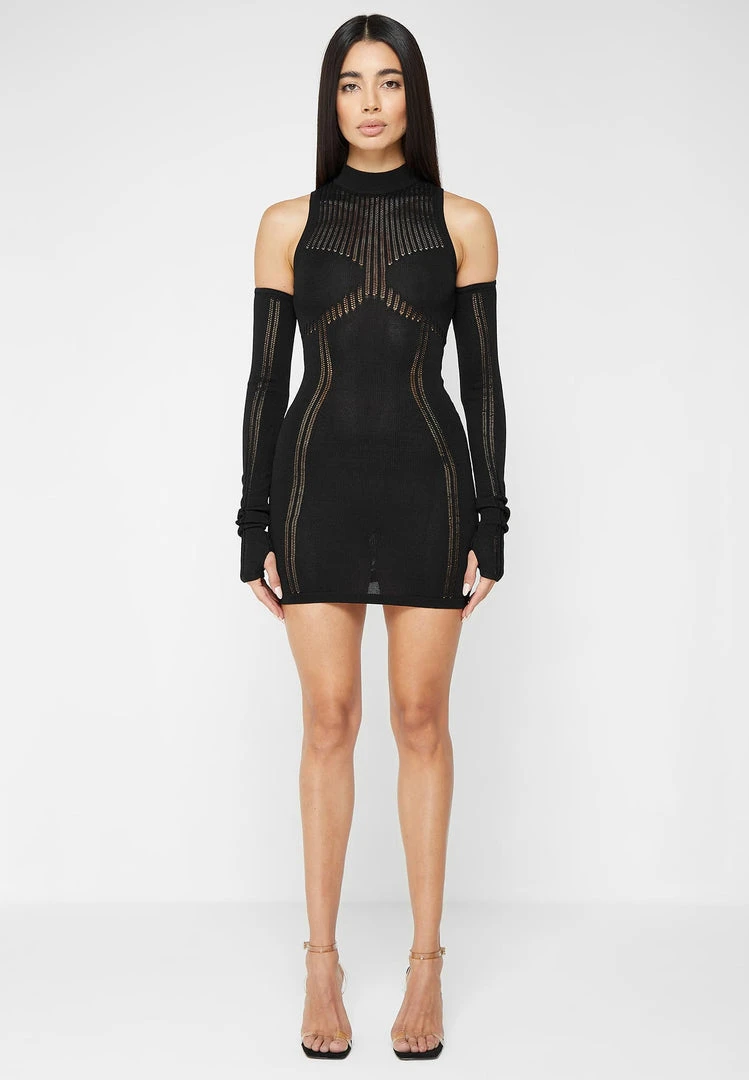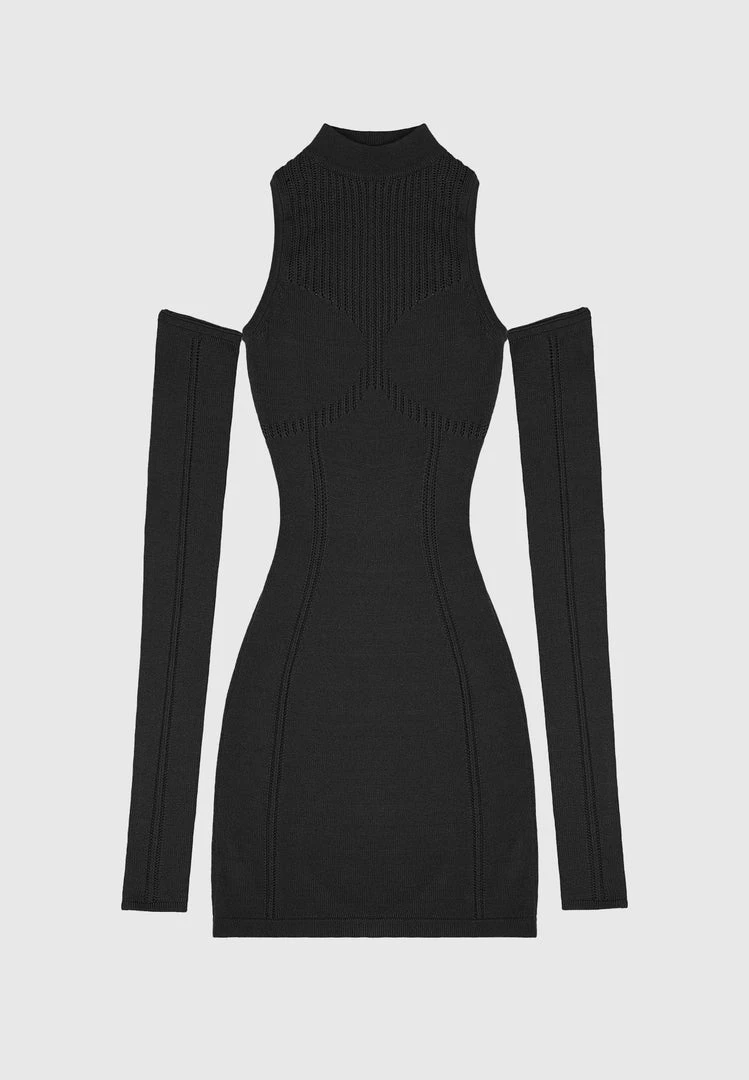 In our classic stretch yarn fabric, this dress features carefully placed wide knit contrasting to seductively contour the body.