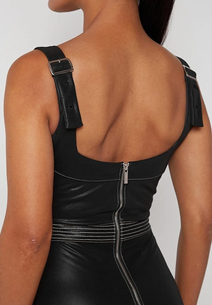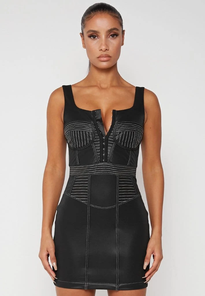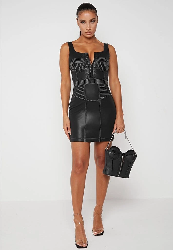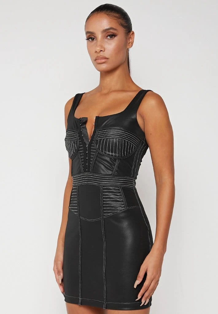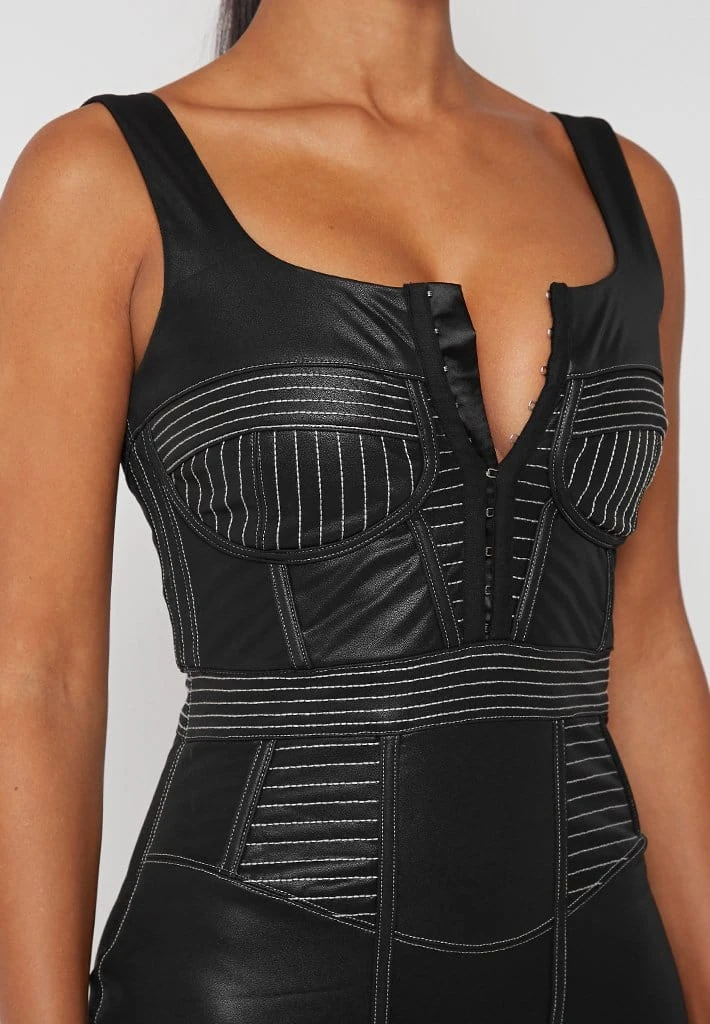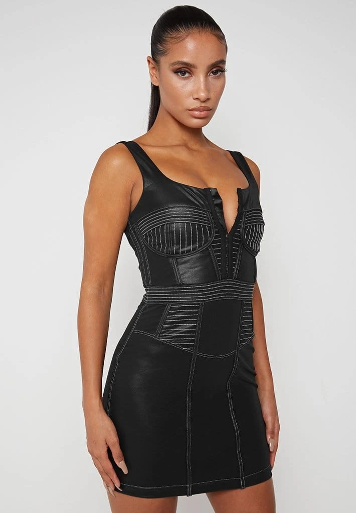 Black Vegan Leather Corset Dress with Contrast Stitch