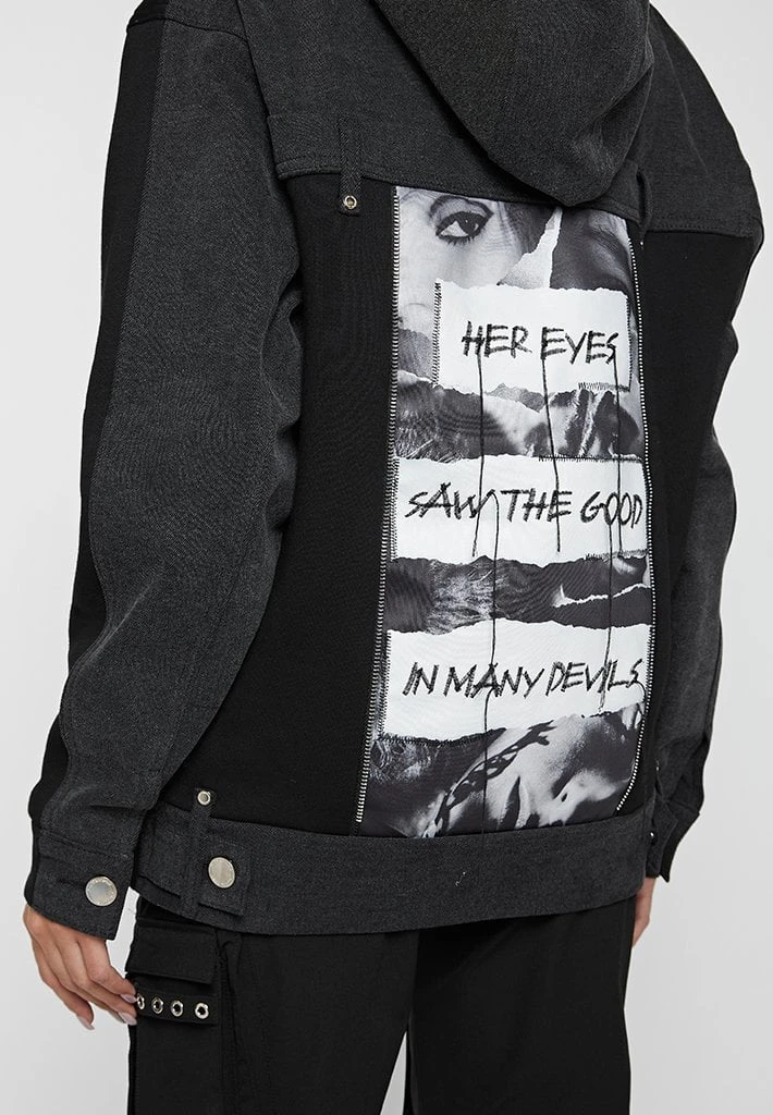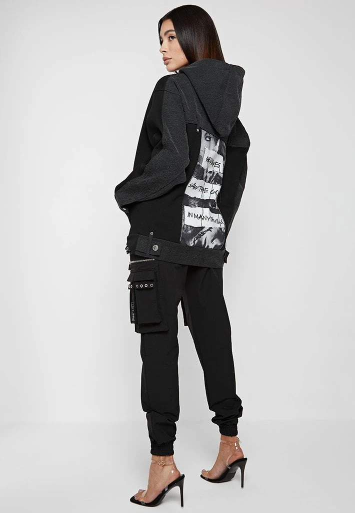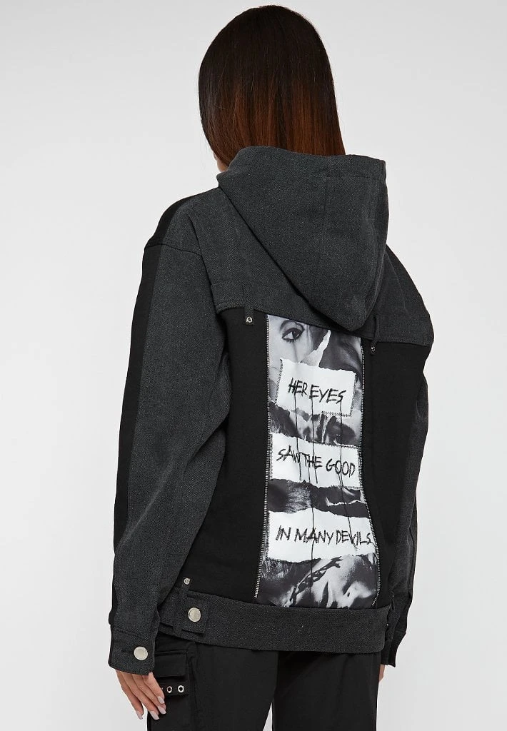 Washed Black Denim Panel Graphic Hoodie