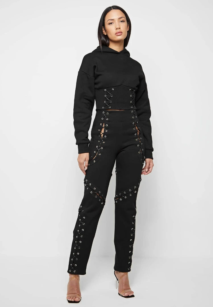 This 3-piece Lace Up Jogger set provides a high fashion twist on loungewear that can be worn with heels to create a smart/casual jogger set.