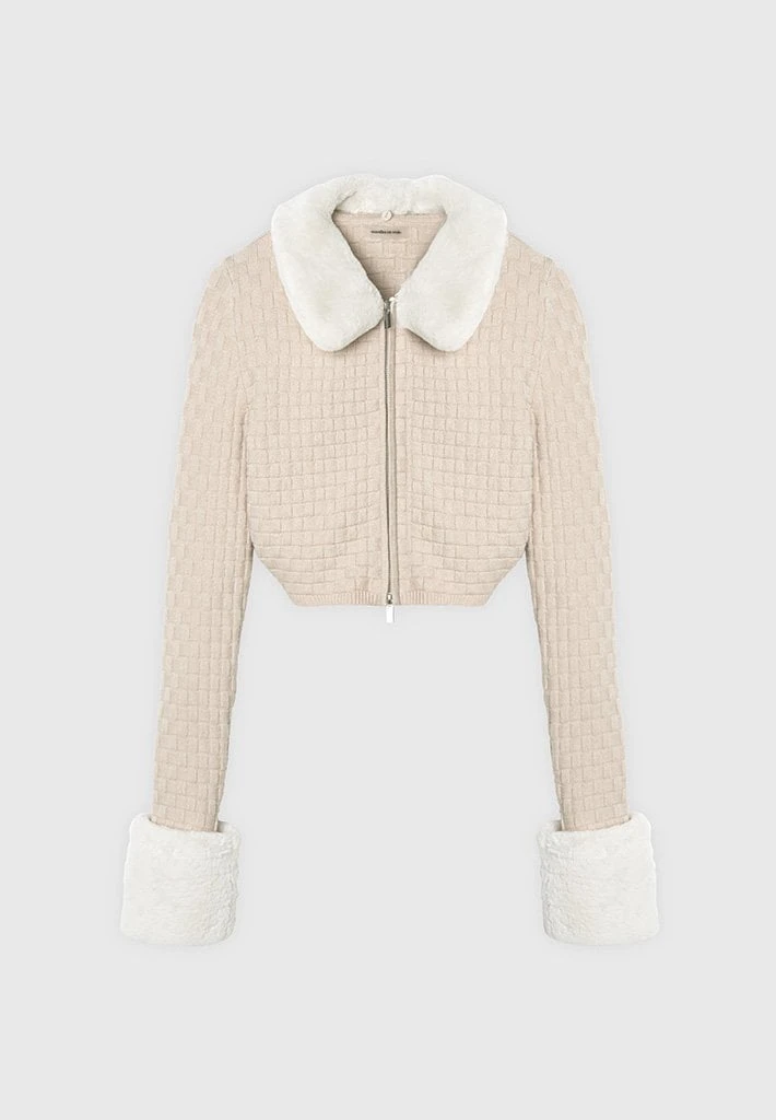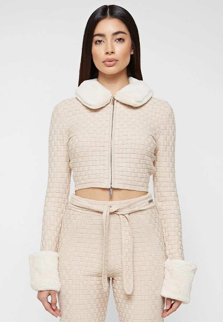Featuring soft touch plush trims on the collar and cuffs, paired with the basketweave knit texture – this jacket perfectly compliments any outfit for a night out. The plush details are fully detachable for versatile styling.