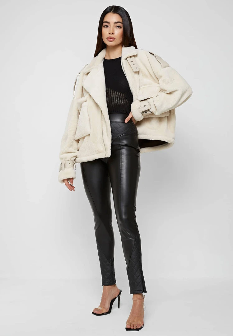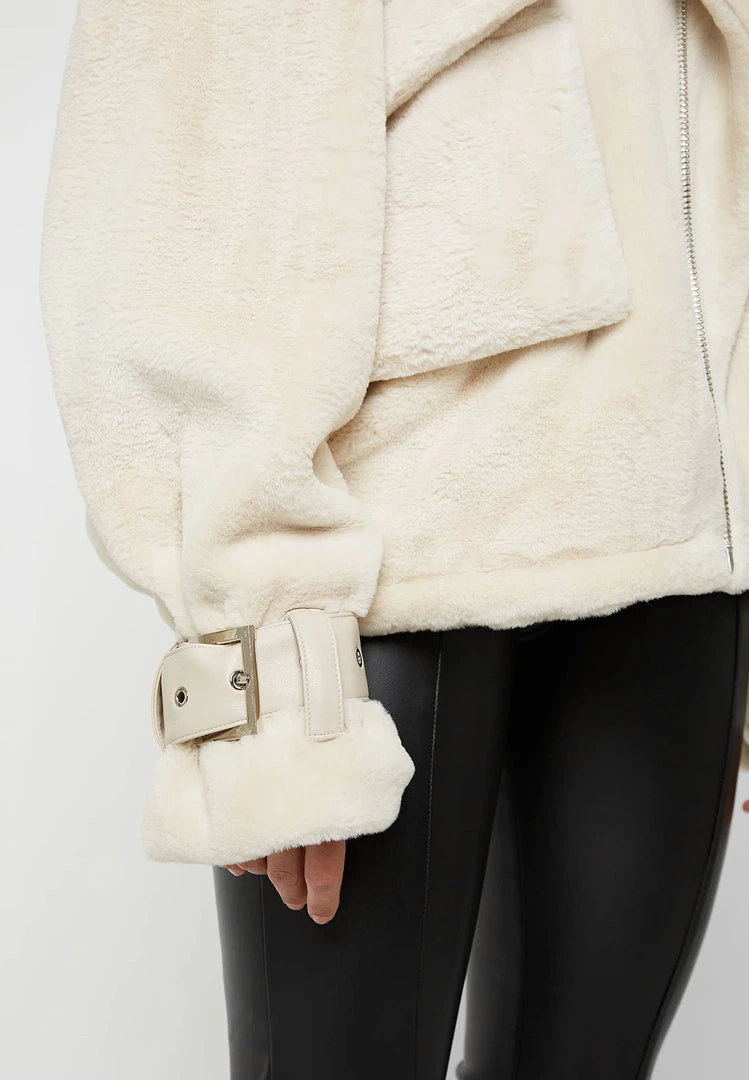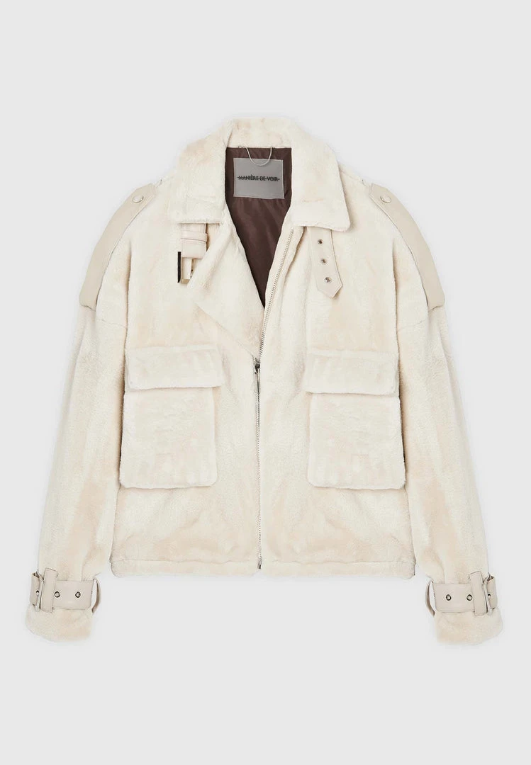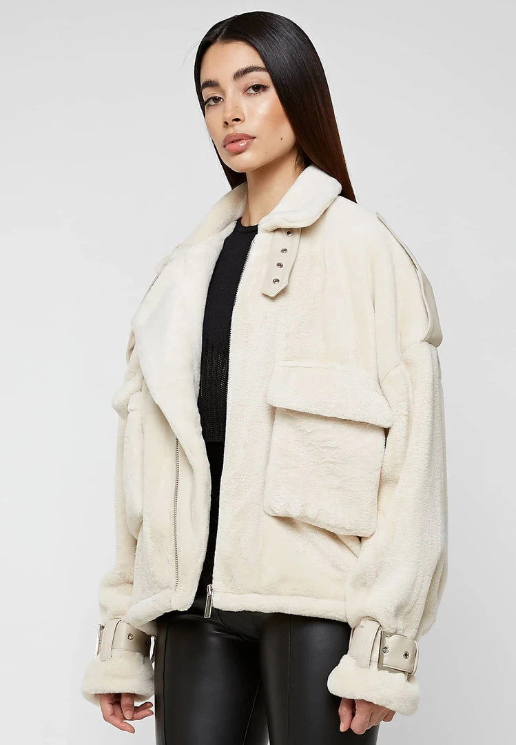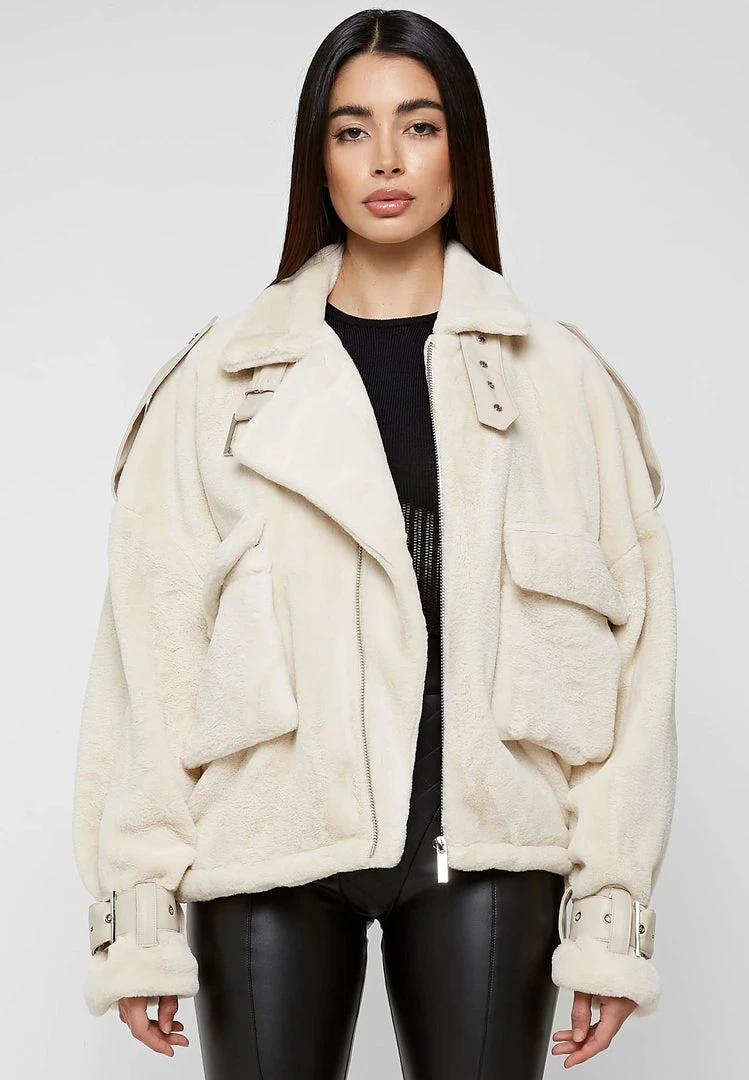 Beige Oversized Plush Biker Jacket