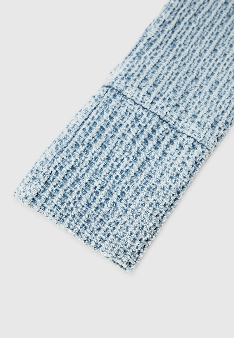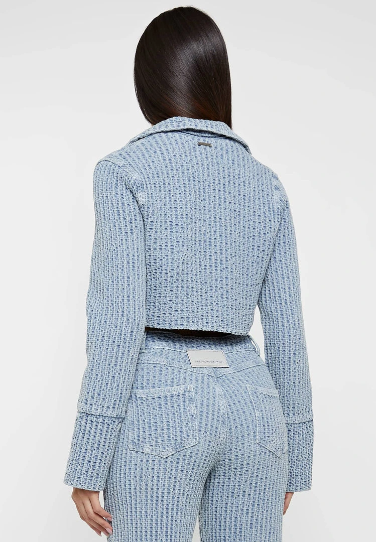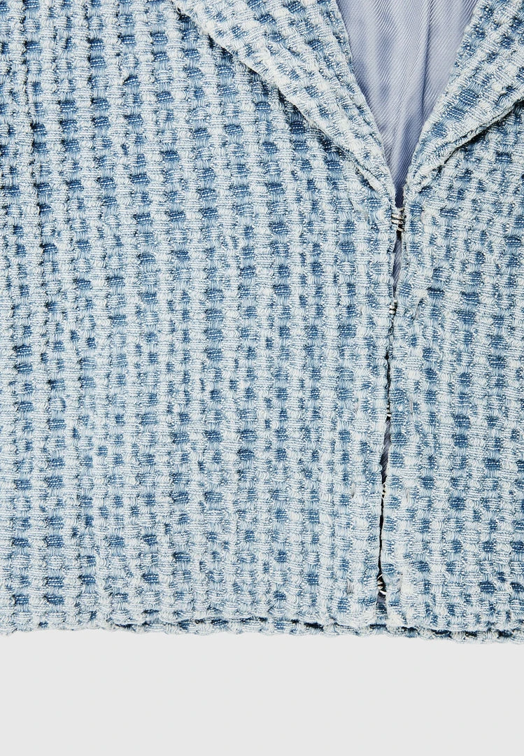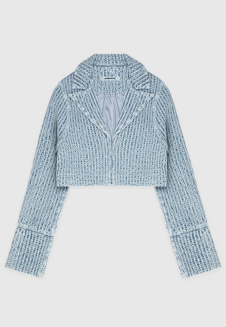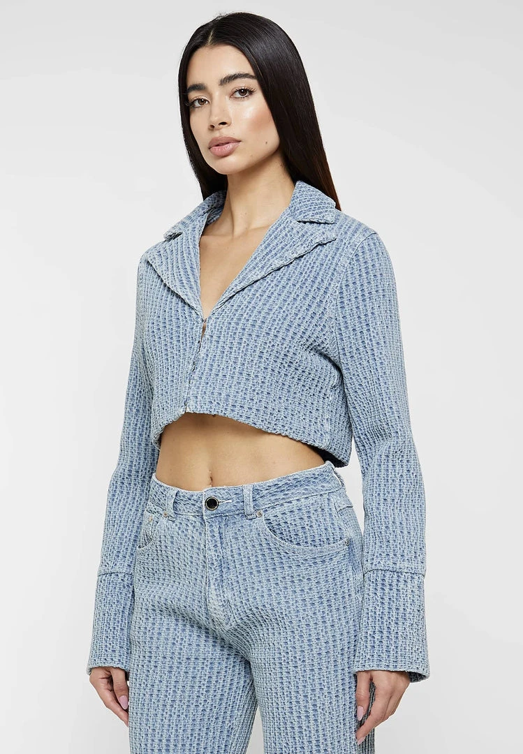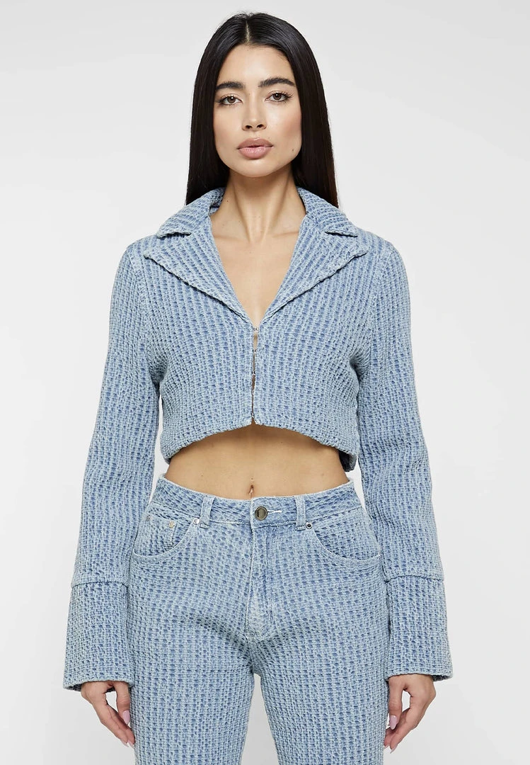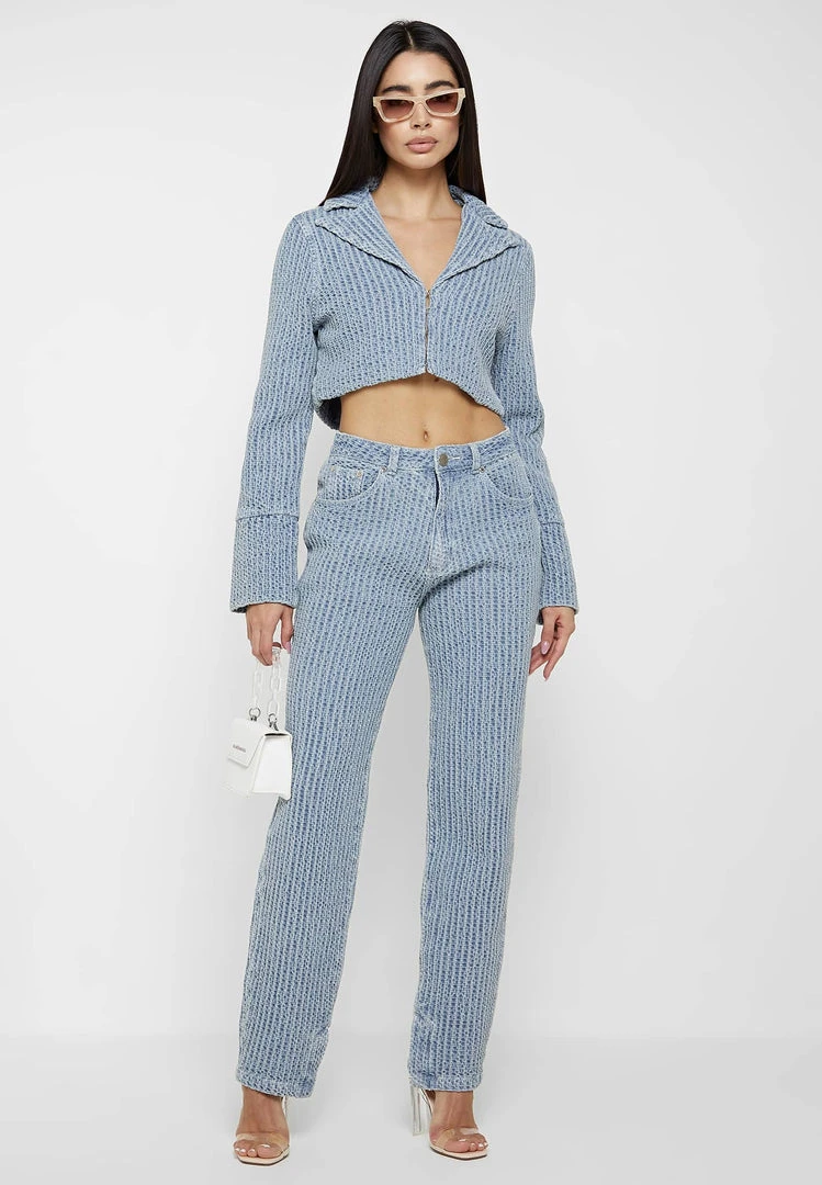 This boucle denim set is perfect for any day to night occasion. The blazer style top mixed with the relaxed mom jeans makes this the perfect smart casual outfit.
