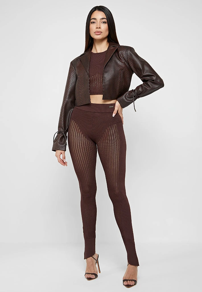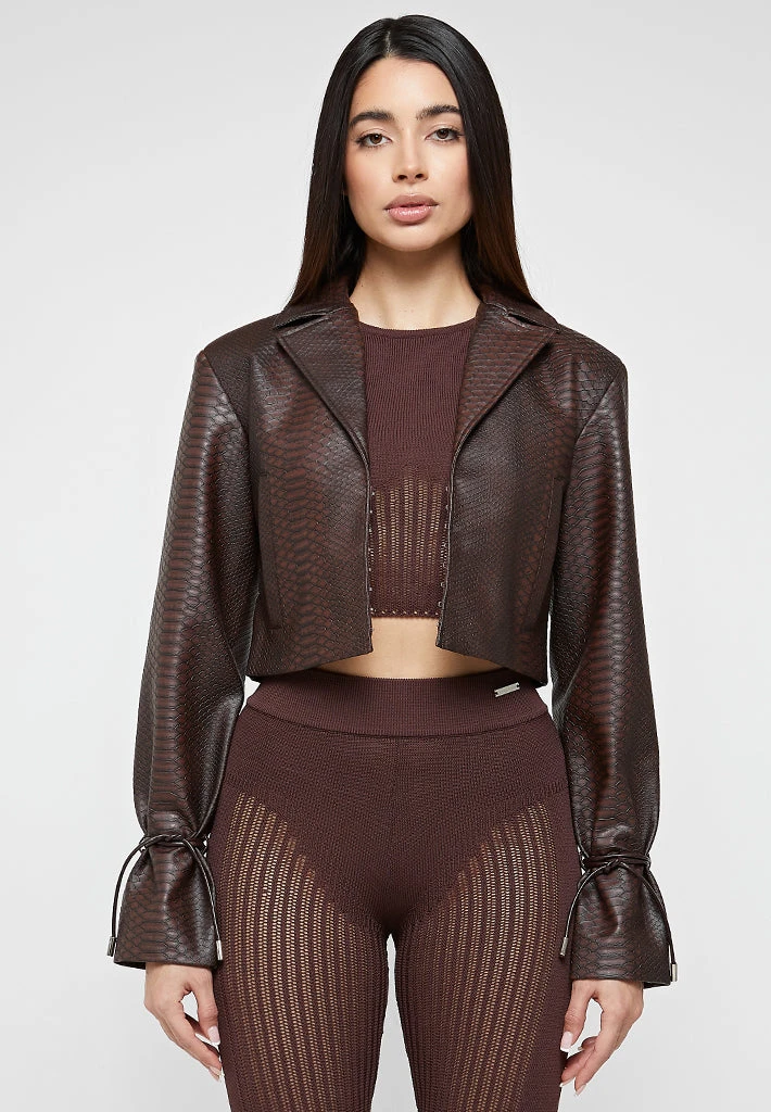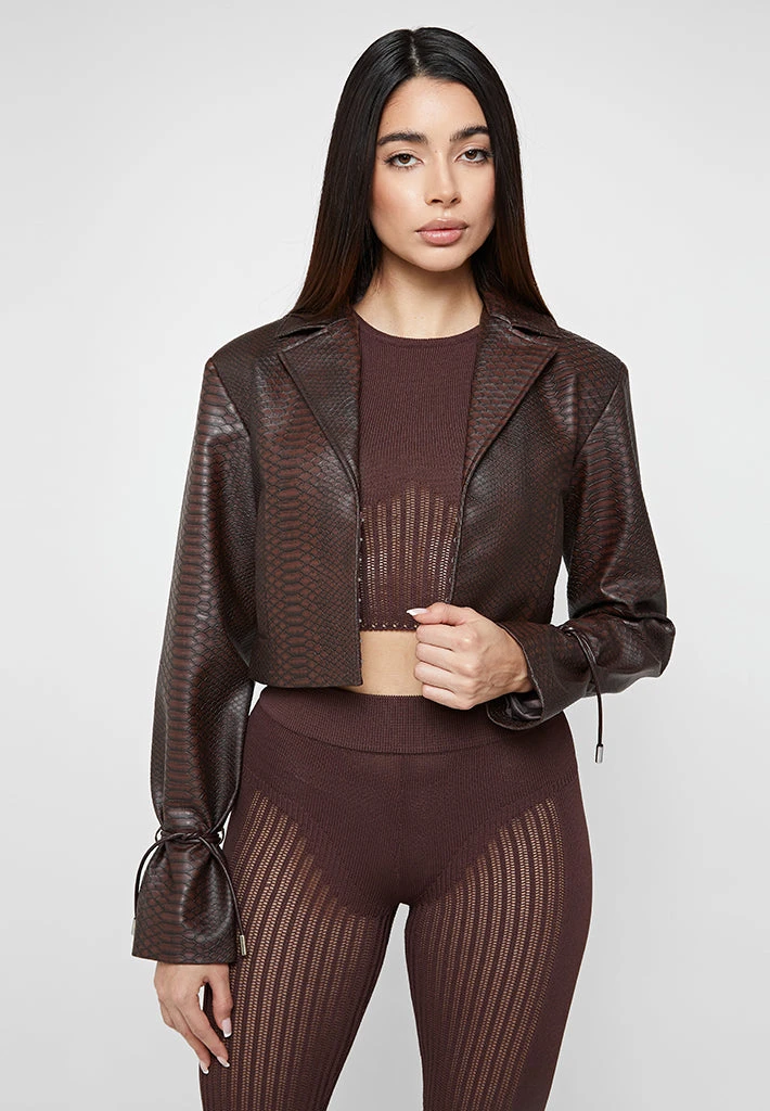 This vegan leather croc jacket is the perfect addition to any outfit with removable ties to suit any preference.