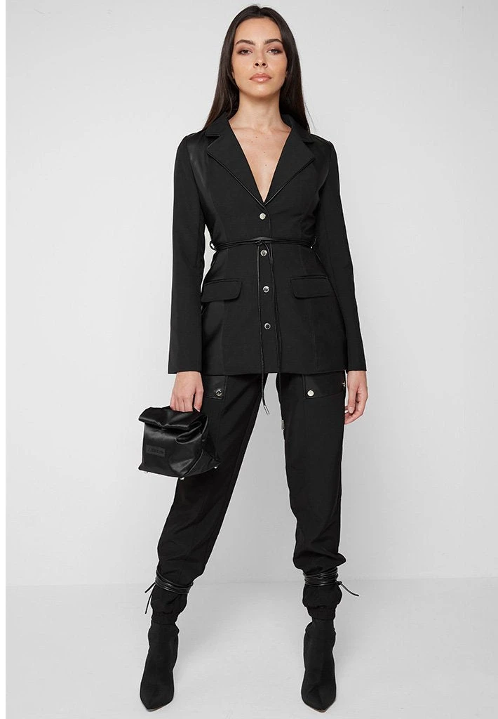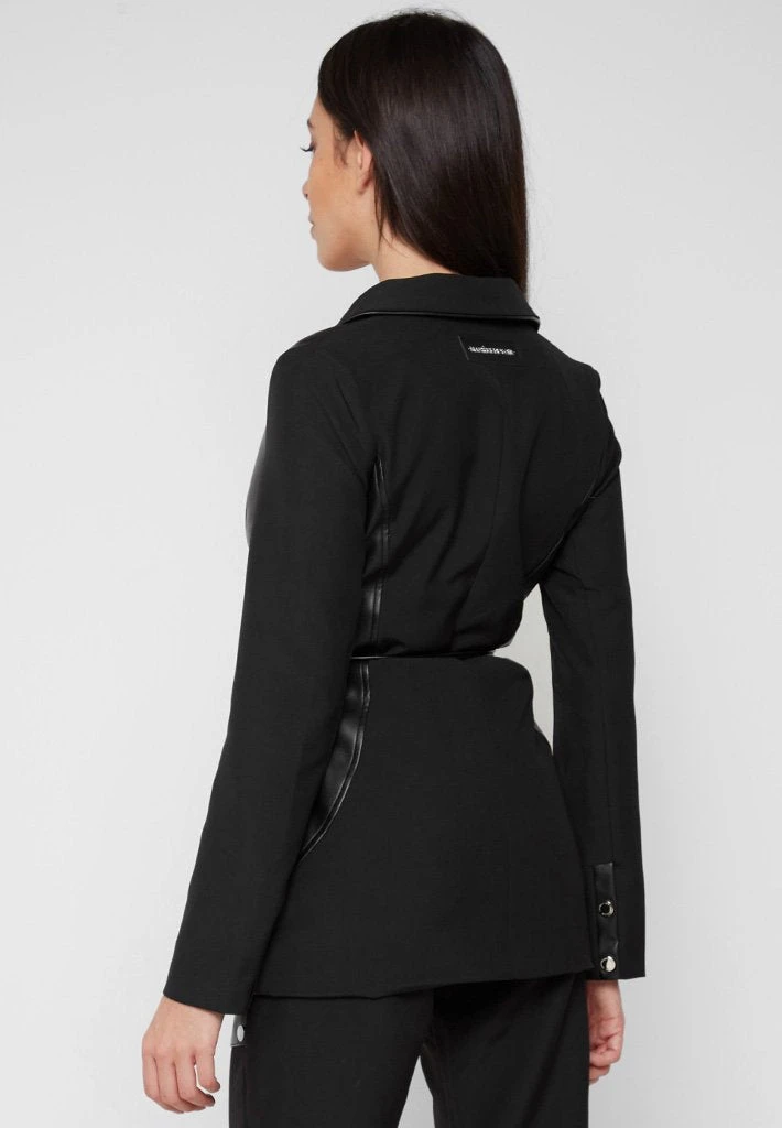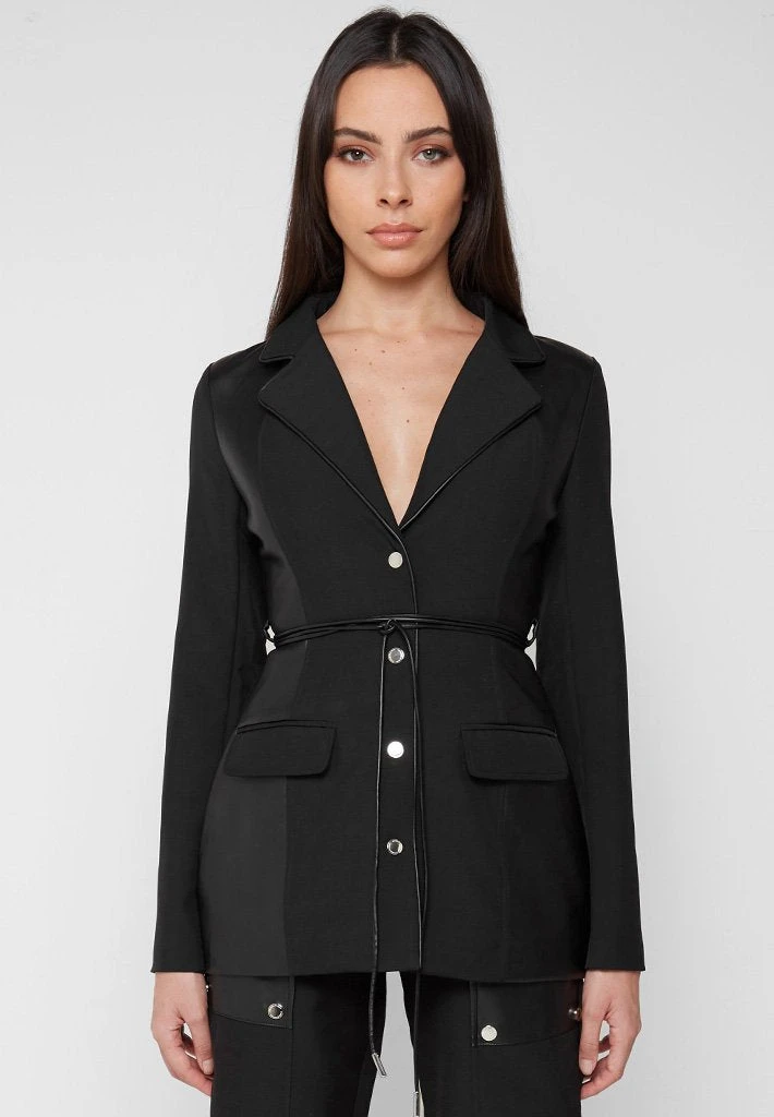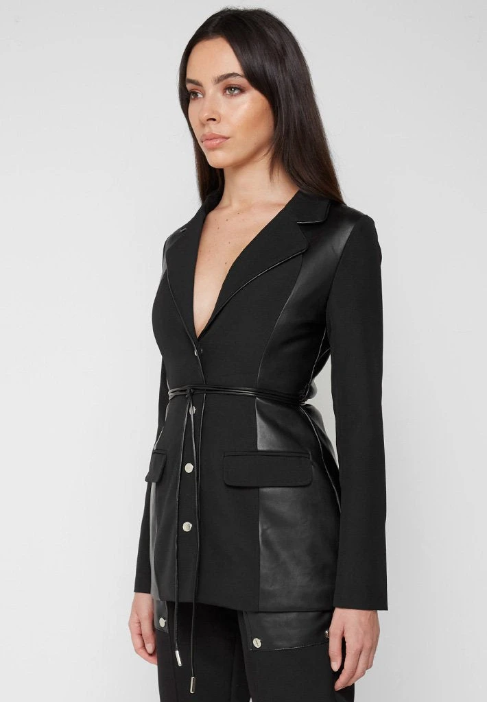 Fabric: Main: 80% Polyester 17% Rayon 3% Elastane Contrast: 55% Polyester, 45% PU