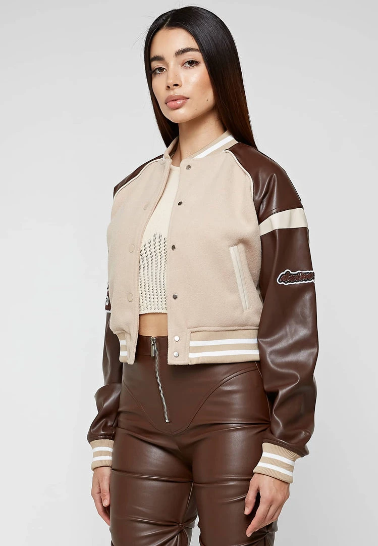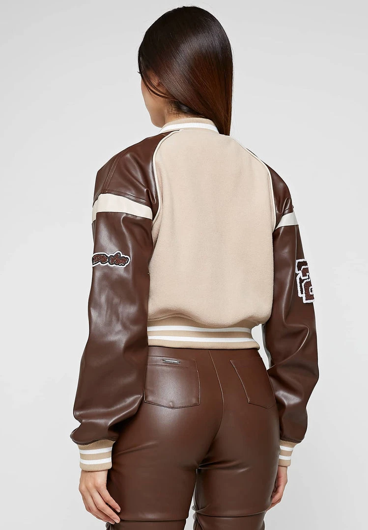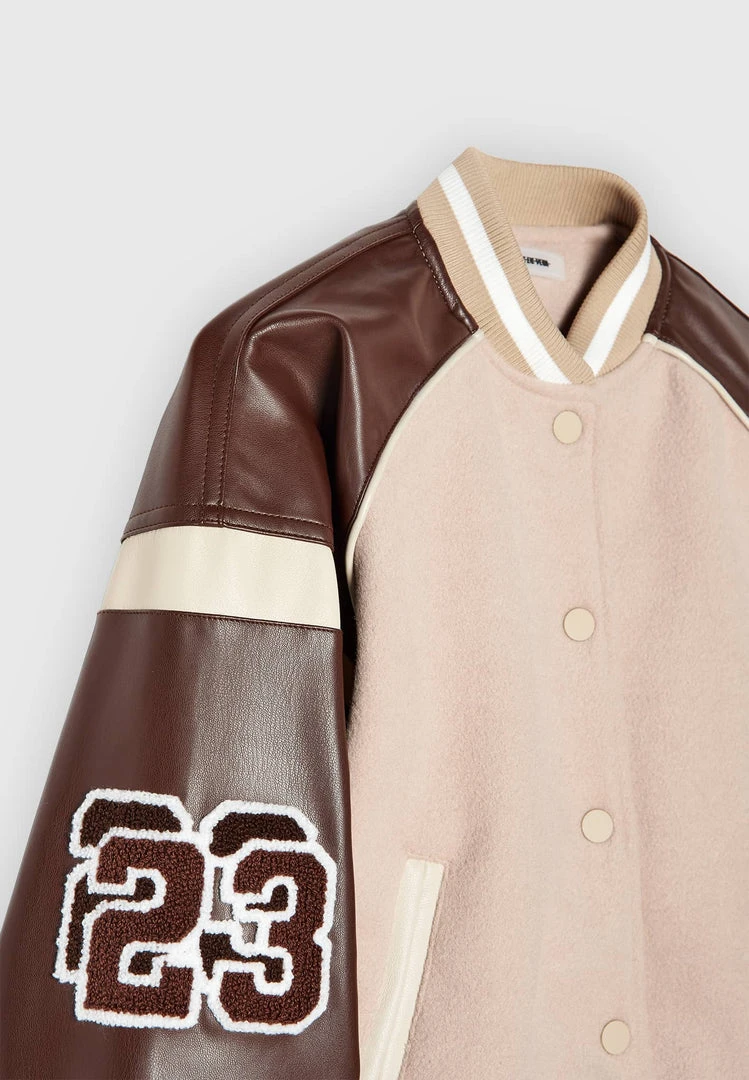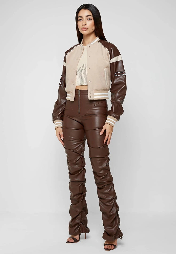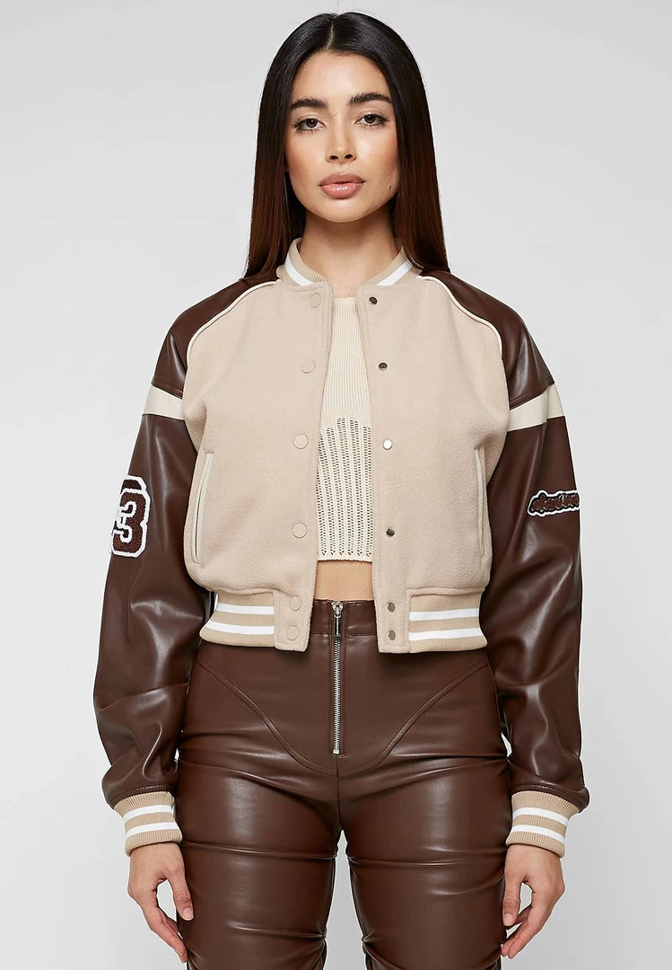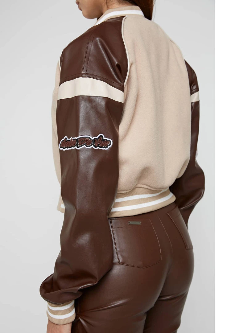 Beige Vegan Leather & Wool Varsity Jacket