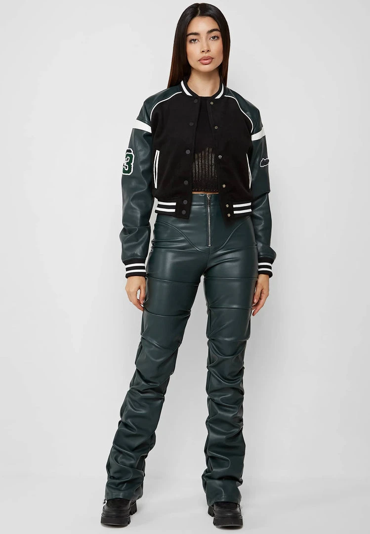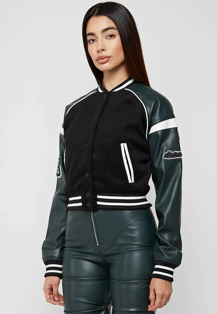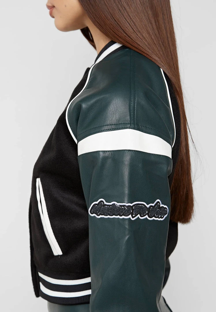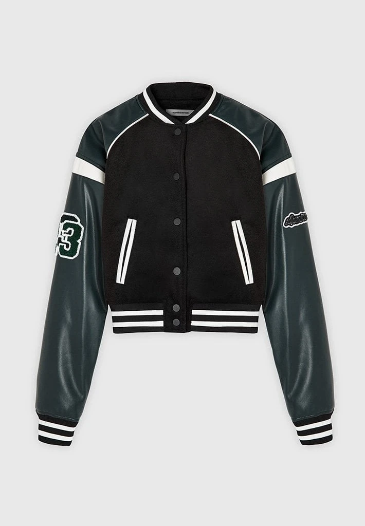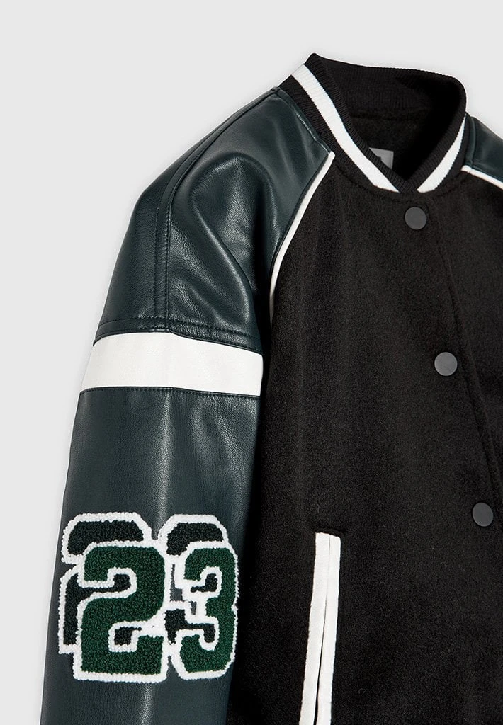 This varsity jacket includes themed towelling patches with 3D embroidered borders for both the “23” and the logo. Packed with detail in textural contrast from the vegan leather to the soft wool and smart rib. Subtle touches are considered with the tone fine rib on them hem and cuffs.