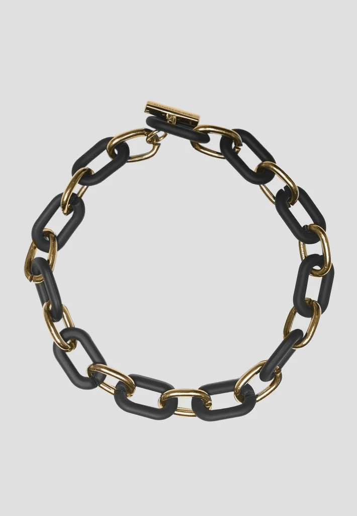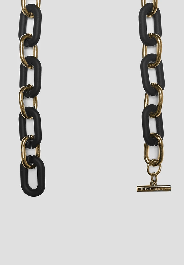 For jewellery that makes a statement, the Matte & Gold Necklace ticks all boxes. With interlocked matte resin and gold chains, this clean and classic design will set well on all kinds of necklines and looks great paired with the matching Matte & Gold Bracelet & Matte & Gold Earrings.