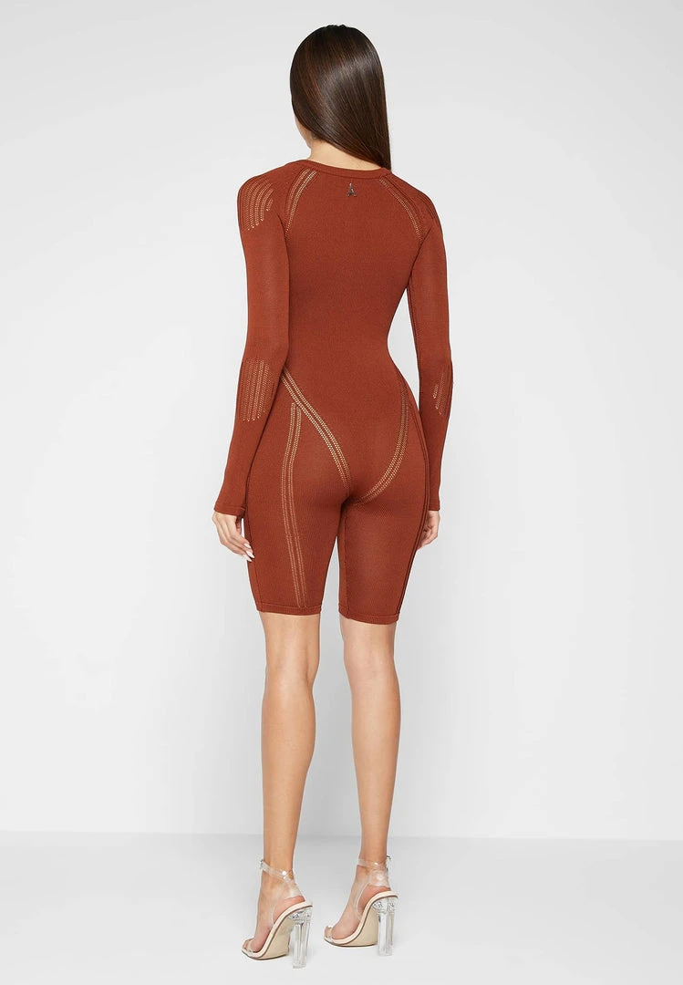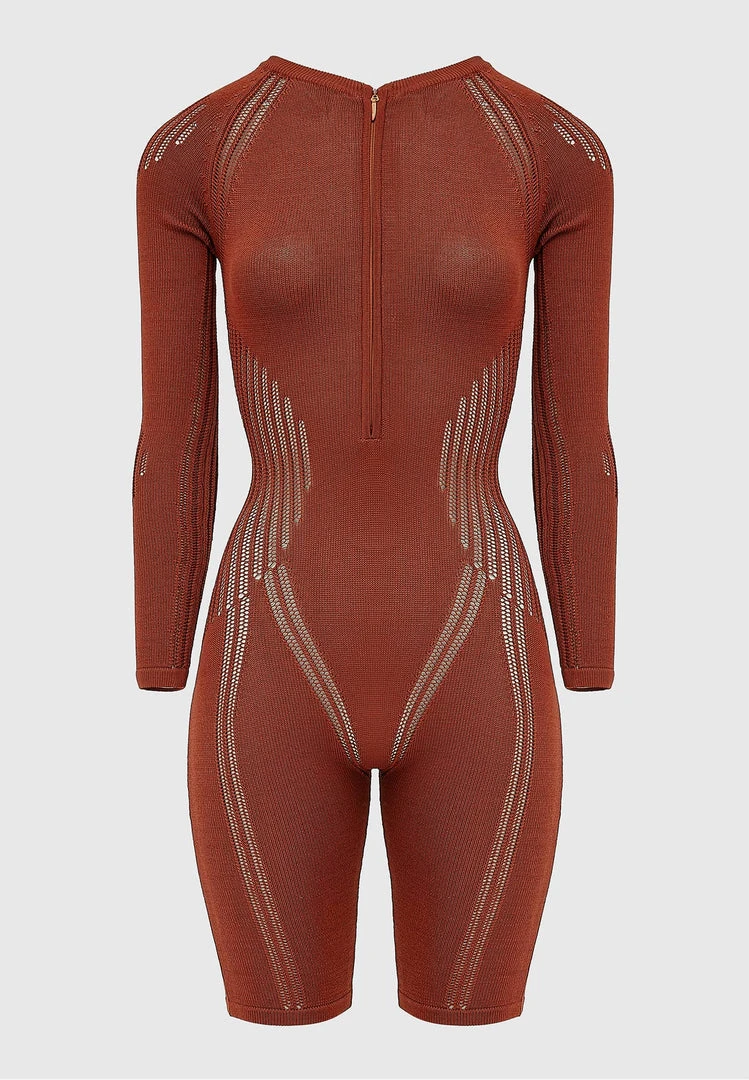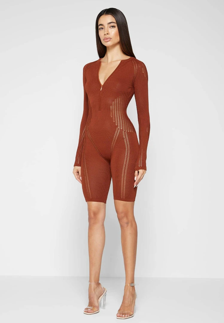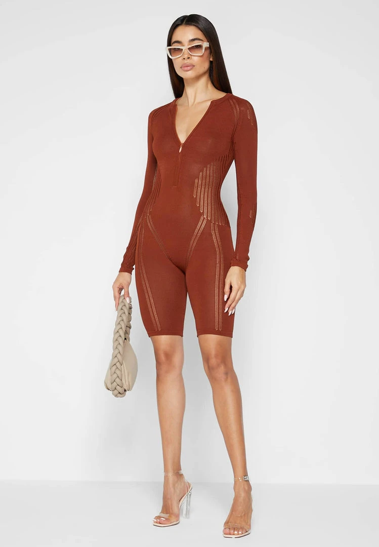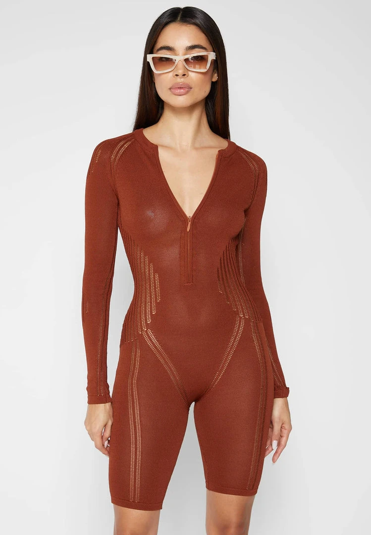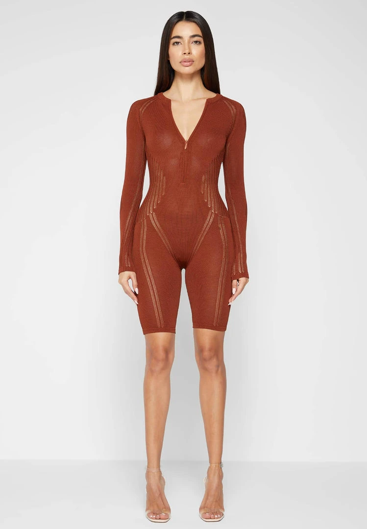 In our classic stretch yarn fabric, this playsuit heavily features wide knit contrasting around the waist to create the illusion of a smaller waist and flatter your hips.