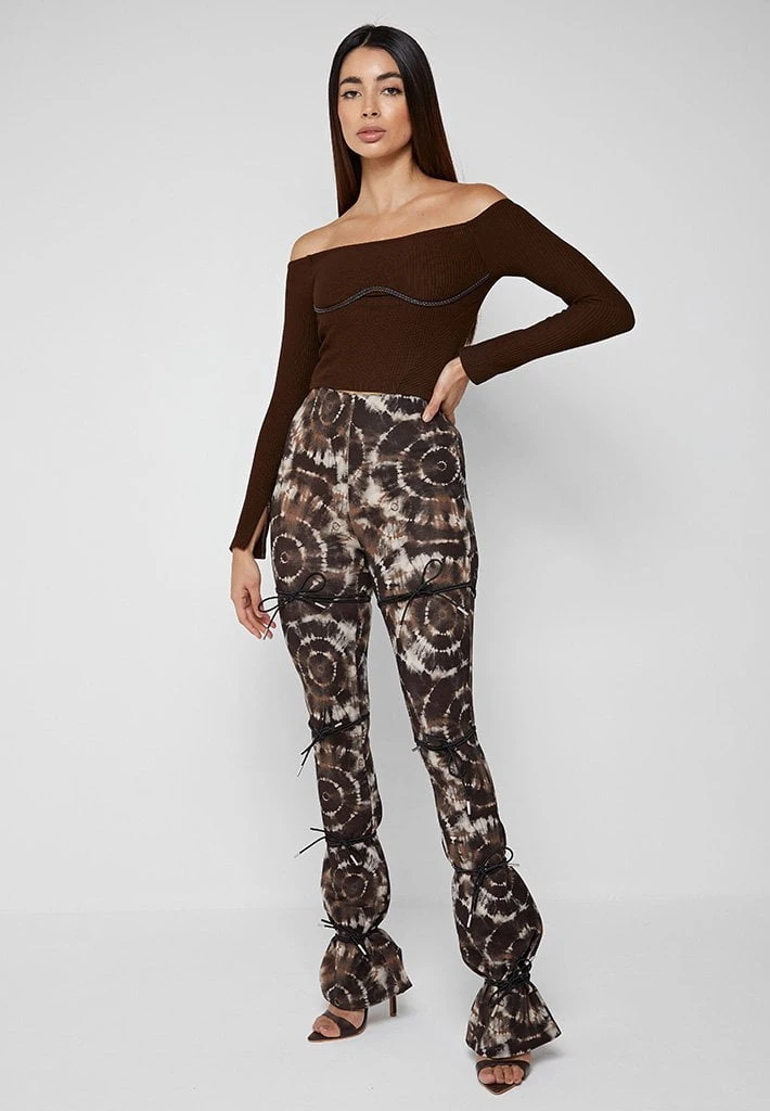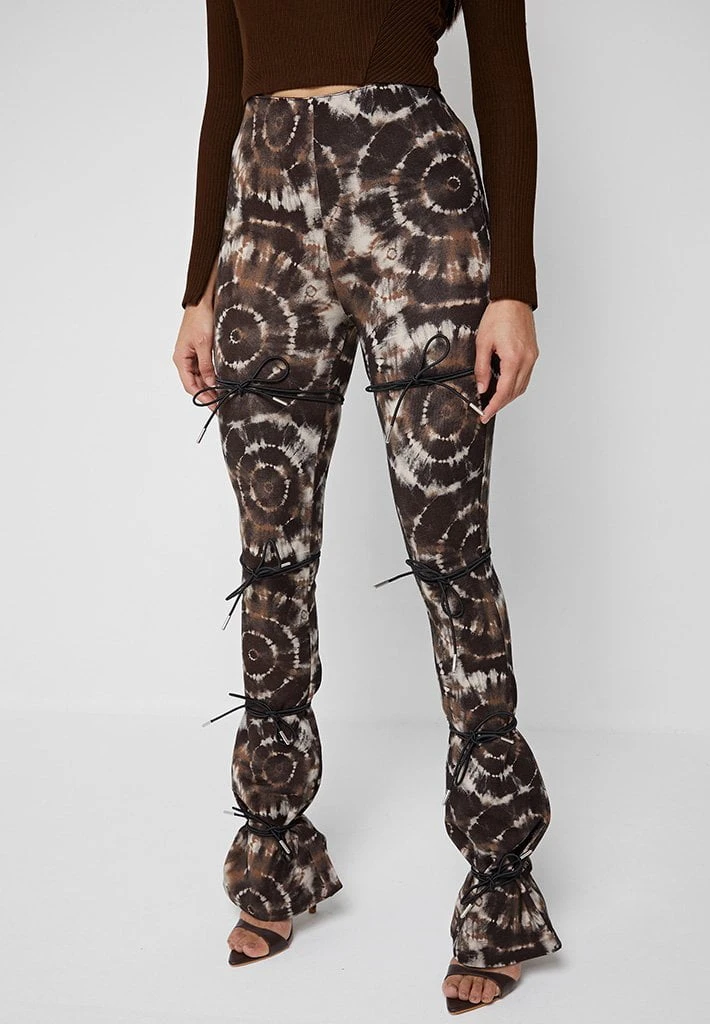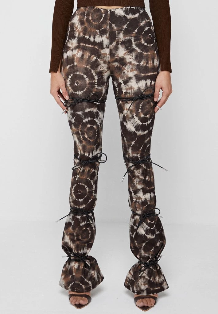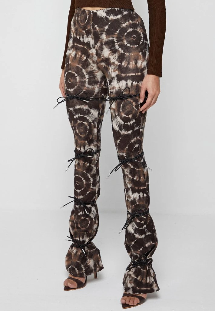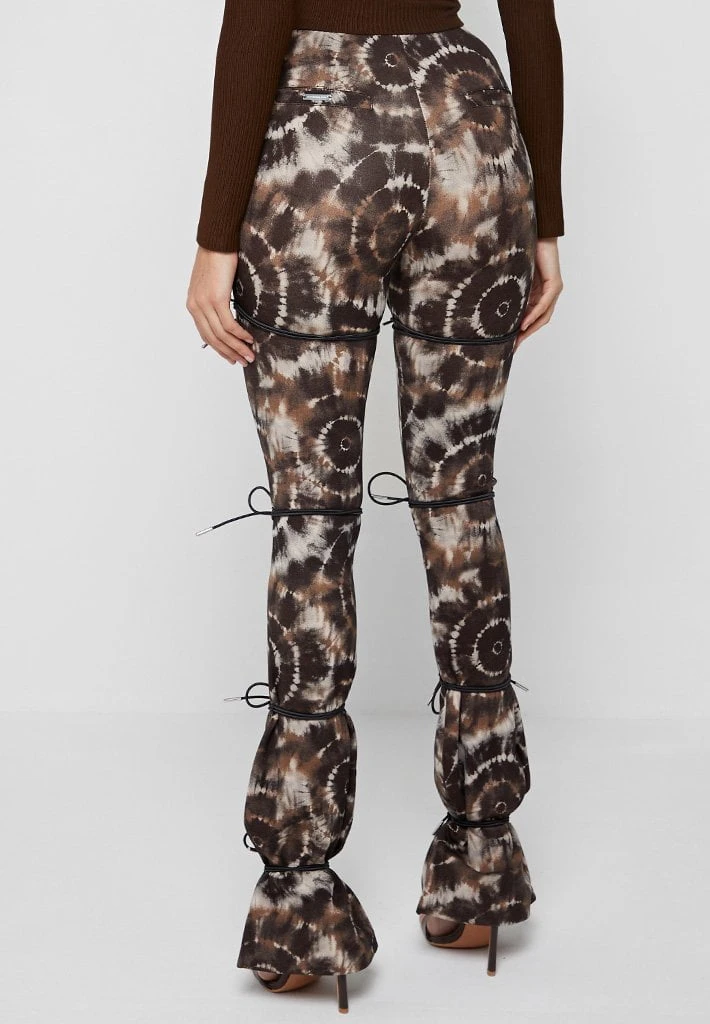 The Printed Tie Up Leggings have been created using an in house designed kaleidoscope style print in cohesively matched tonal hues. The flared silhouette is brought in by tied removable bungee cords for a unique shape. The leggings have been designed with a deep waistband to cinch and contour the waist.