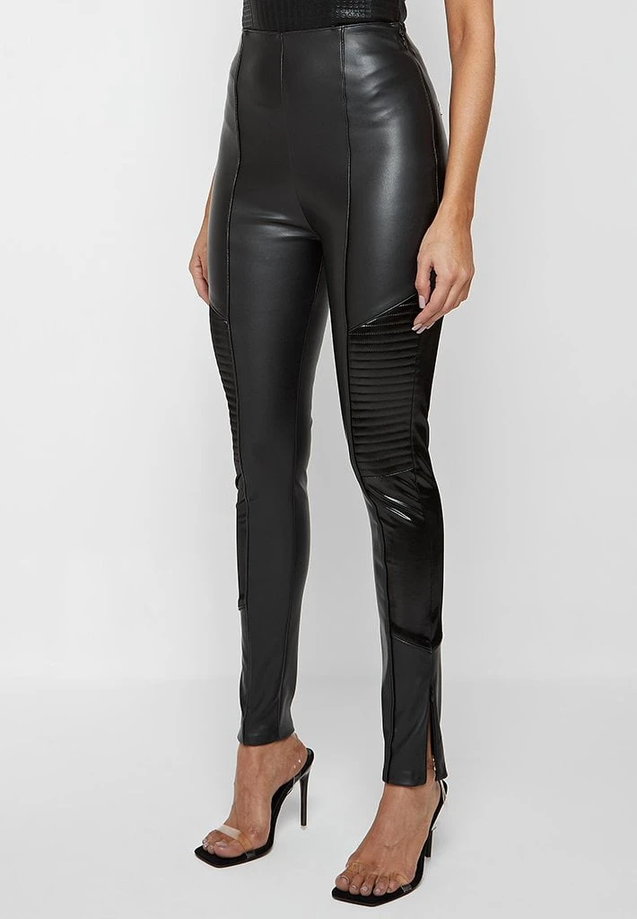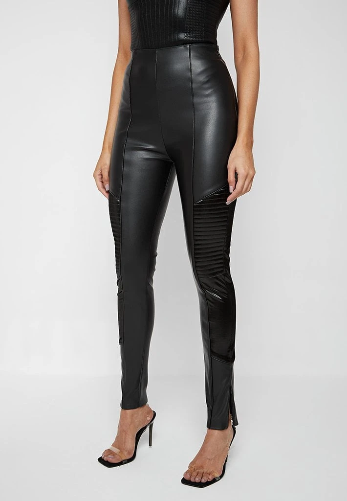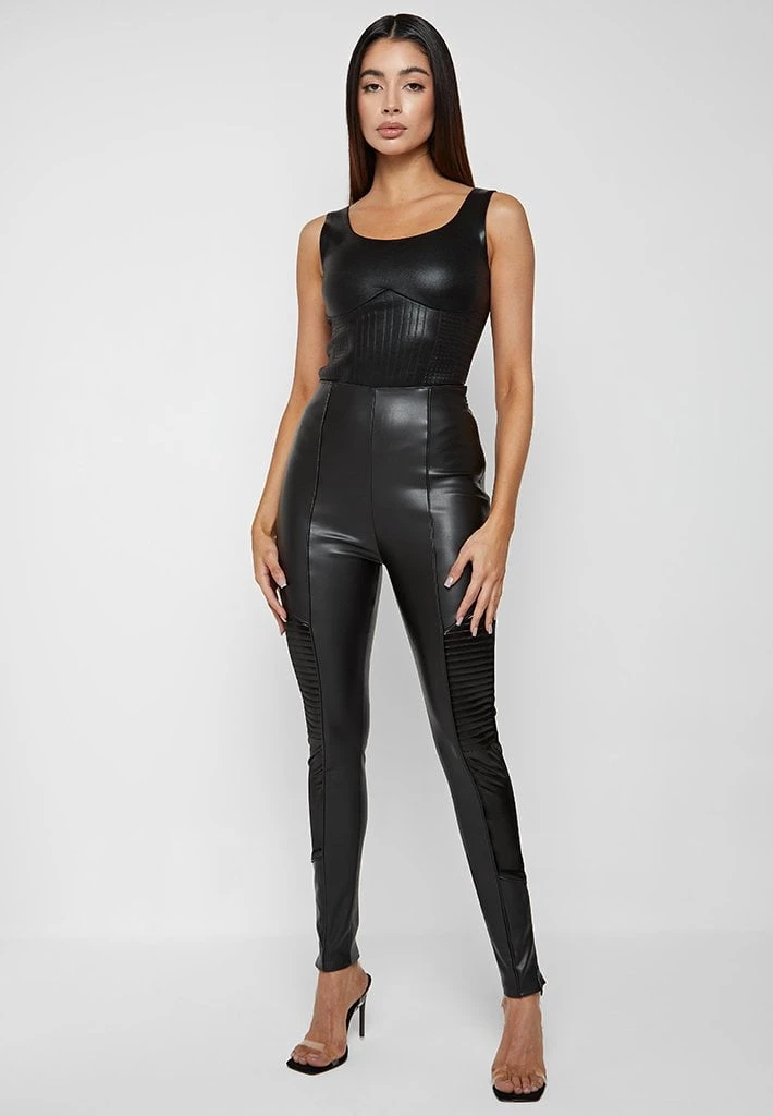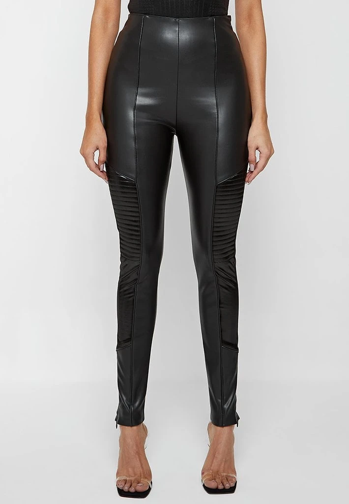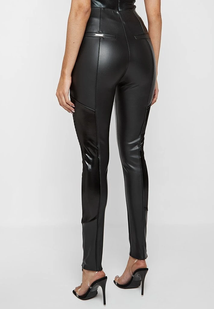 A unique addition to our collection of high quality vegan leather leggings, including high gloss panelling for contouring contrast and self fabric piping for minimal detail.