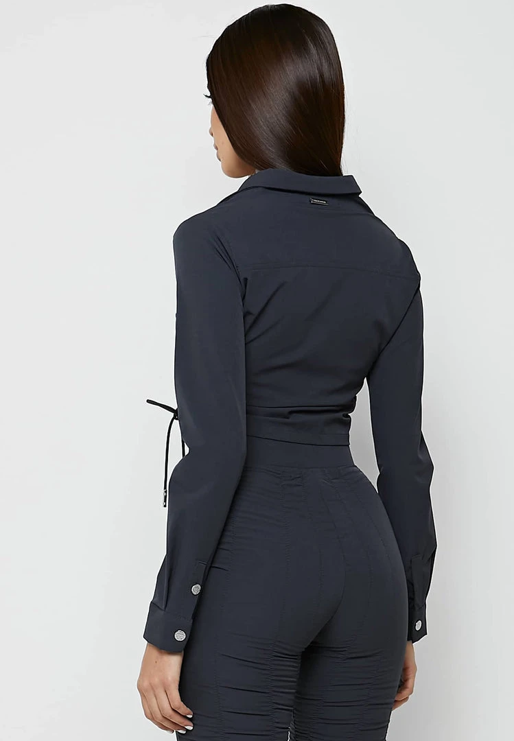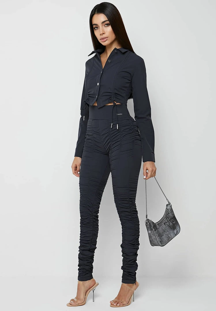 With adjustable ruching, you can amend the length of this shirt as you desire. Details such as textured silver buttons have been included and paired with the leggings, provide an overall sultry evening look.