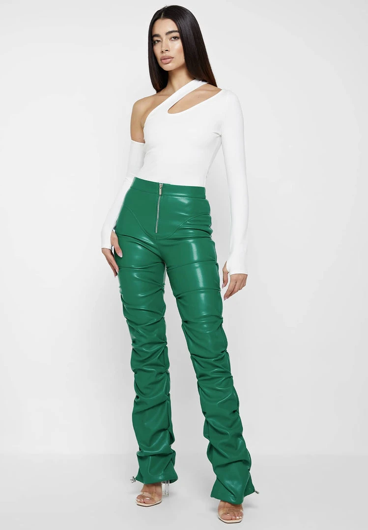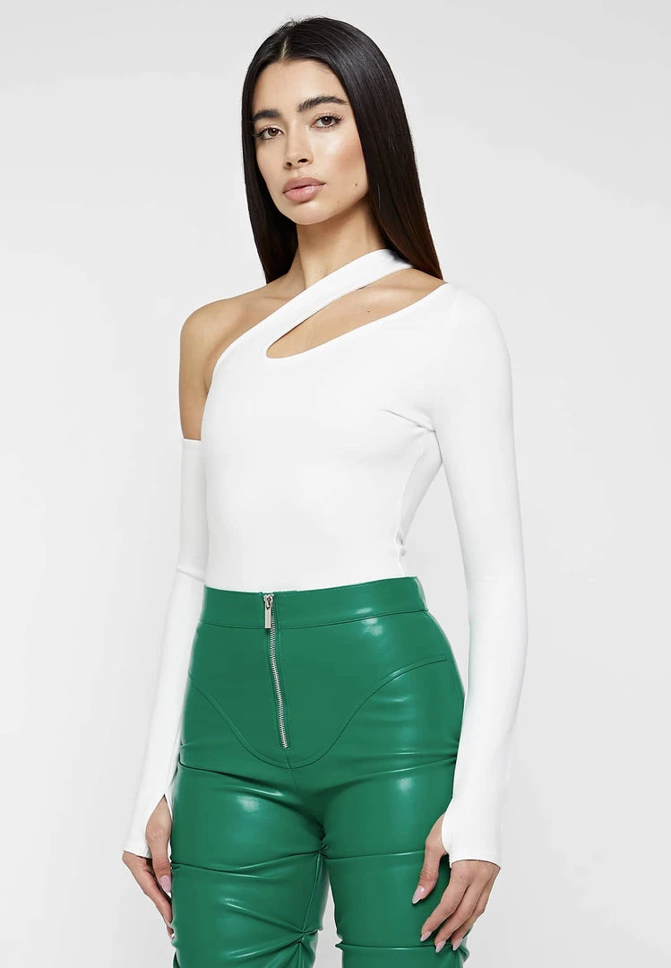 White Asymmetric Bodysuit with Vegan Leather Sleeve