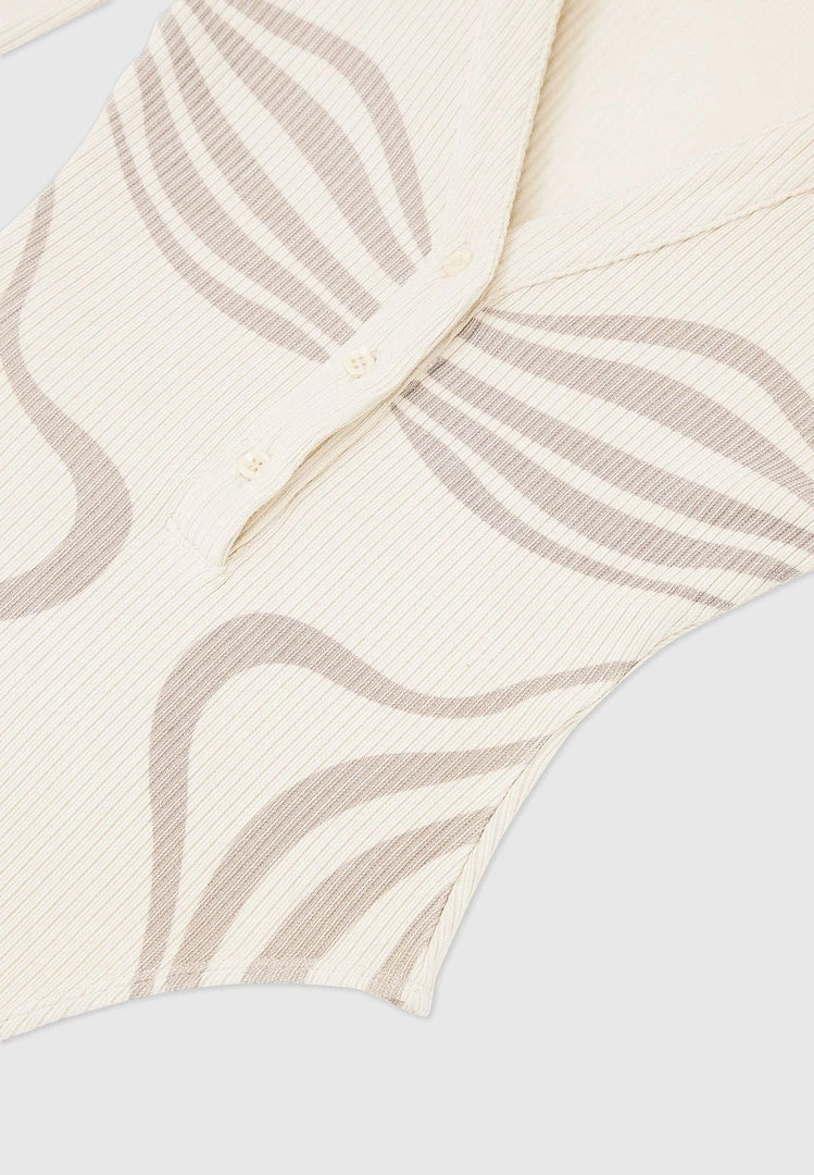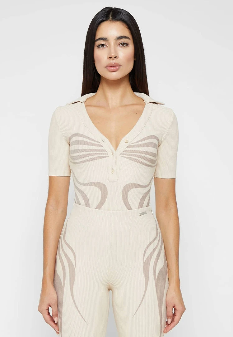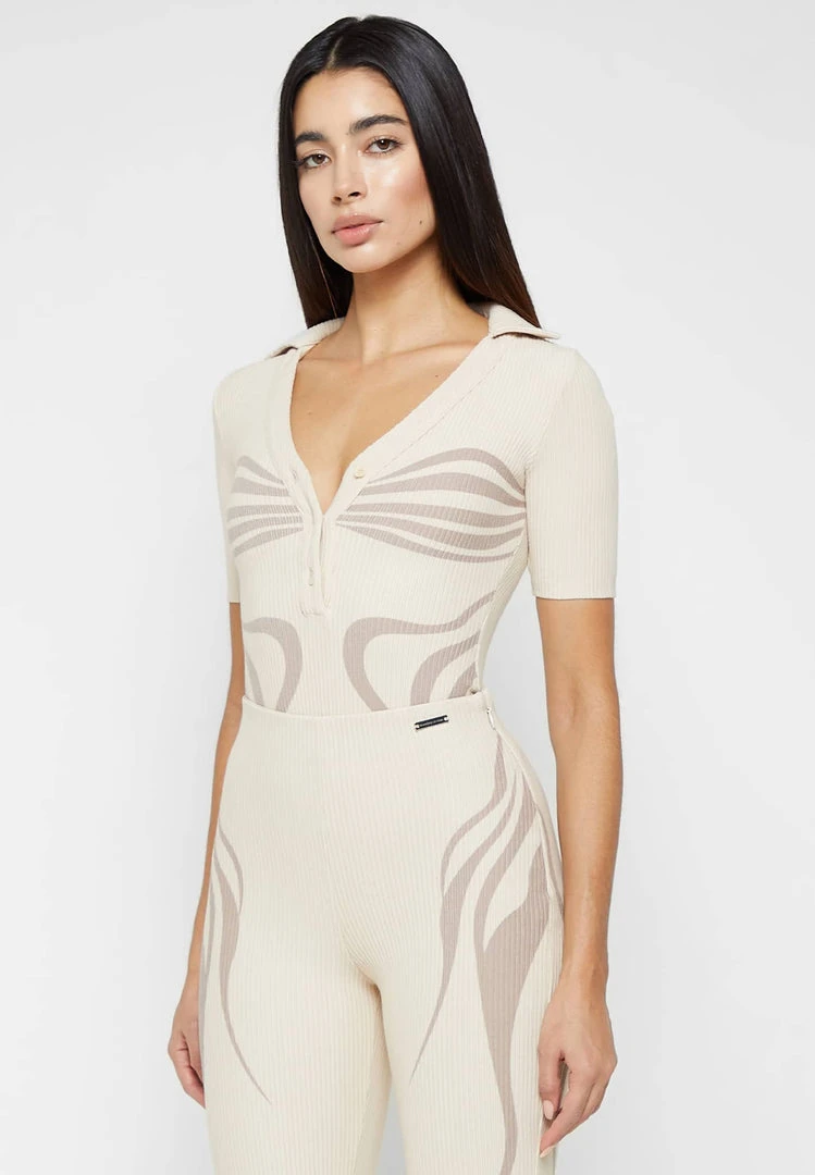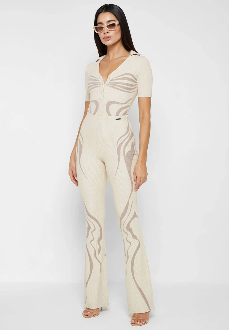 This limited edition set features our unique in-house designed print that carefully contours your body. The bodysuits deep neckline compliments your bust while the internal elasticated waistband in the trousers cinches your waist. The soft ribbed fabric also provides comfort, making this set perfect for day to night occasions.