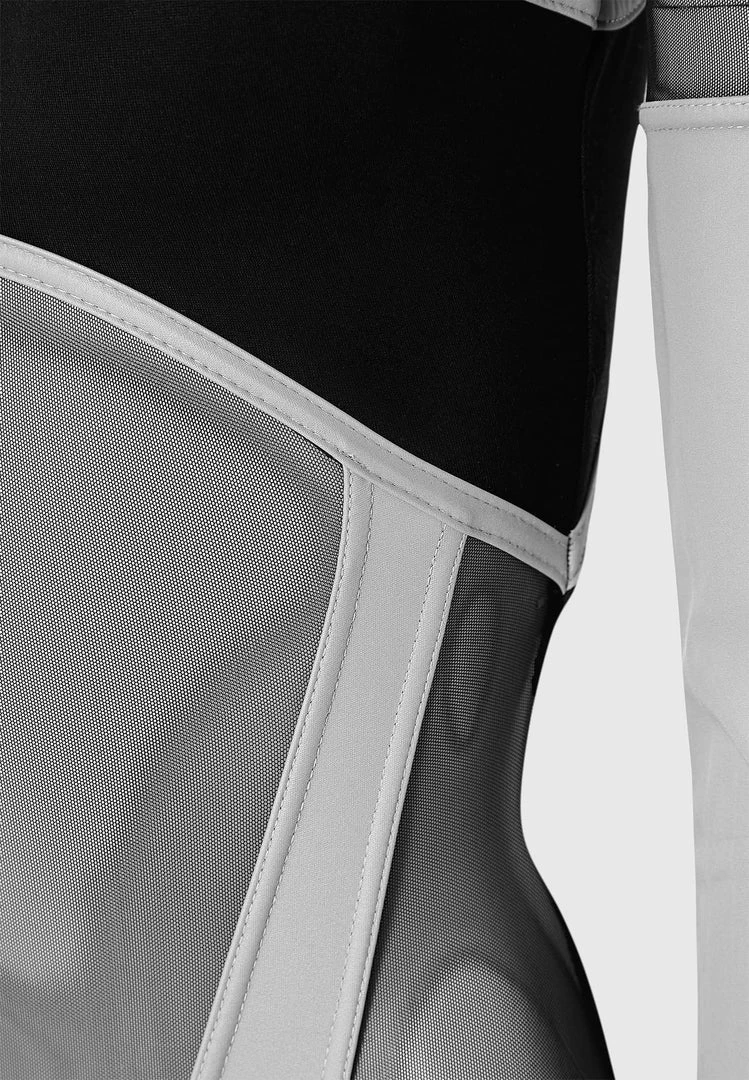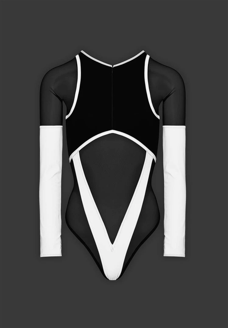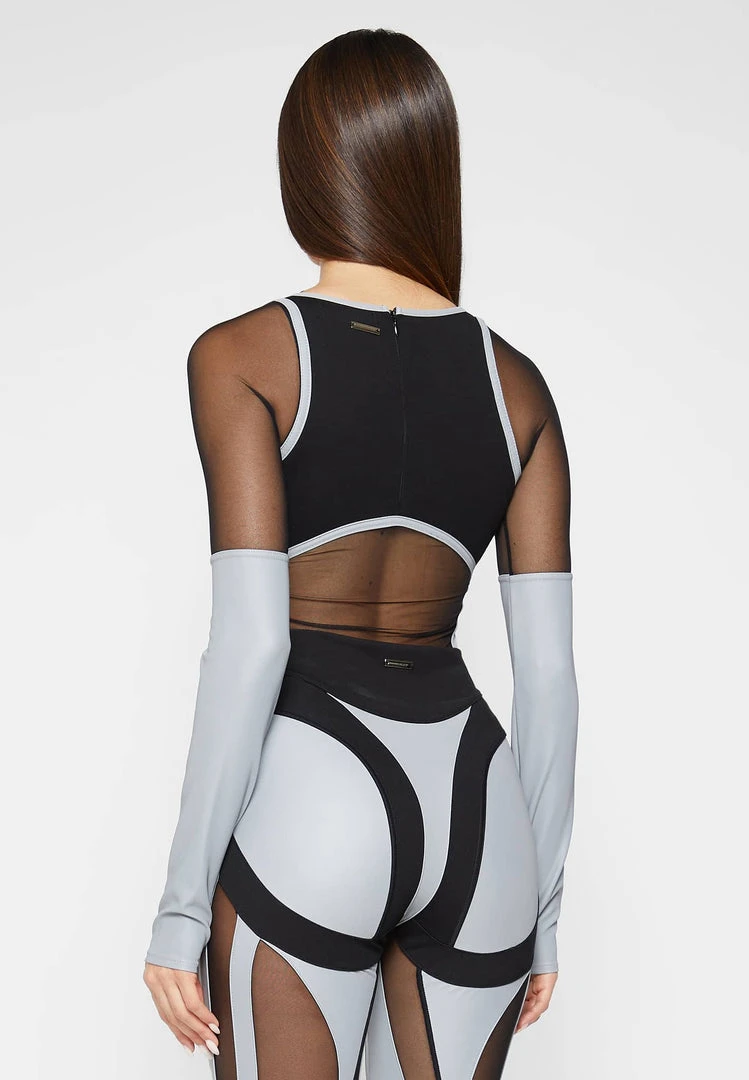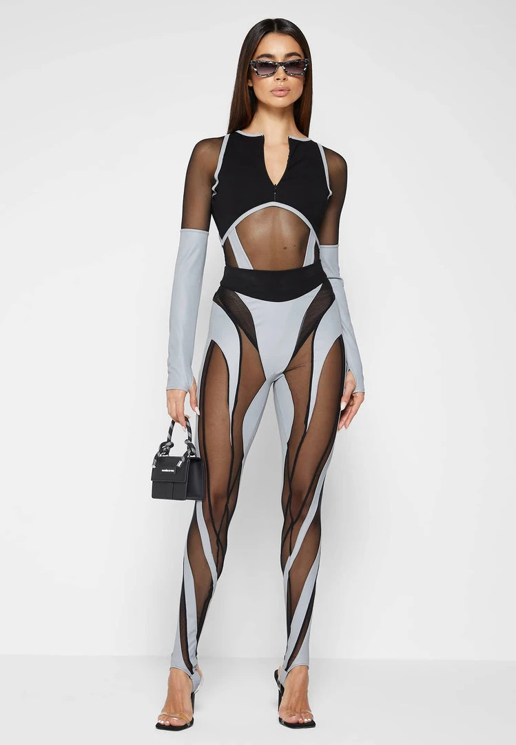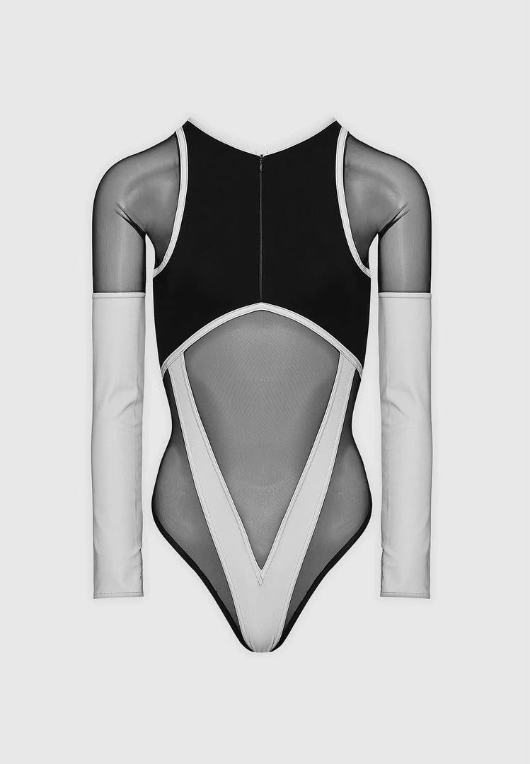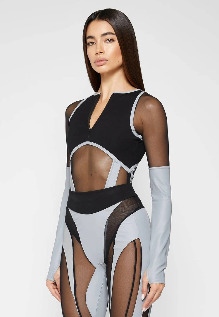 Featuring reflective panelling, this bodysuit is a stand-out piece. The deep V creates the illusion of a smaller waist, perfect for evenings out.