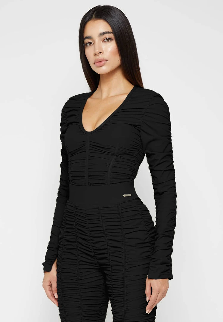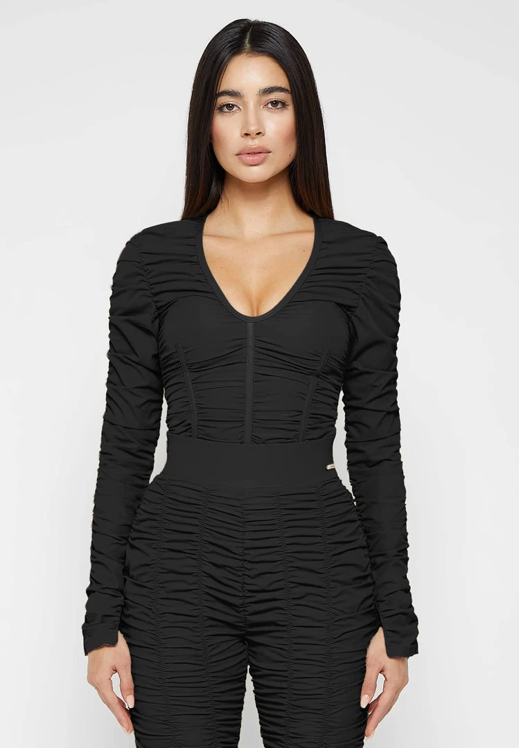 Designed to be a sultry evening look, this set has all over ruching to compliment your figure. This bodysuit features vegan leather piping to give a corset silhouette and accentuate your figure.