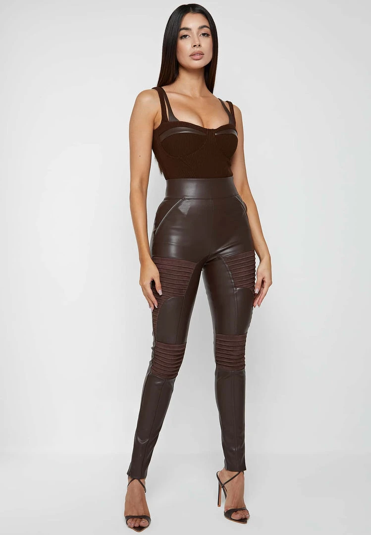 With a flattering neckline, this bodysuit enhances your bust and the twin straps provide additional security. This bodysuit also has textural contrast with the vegan leather against the ribbed fabric.