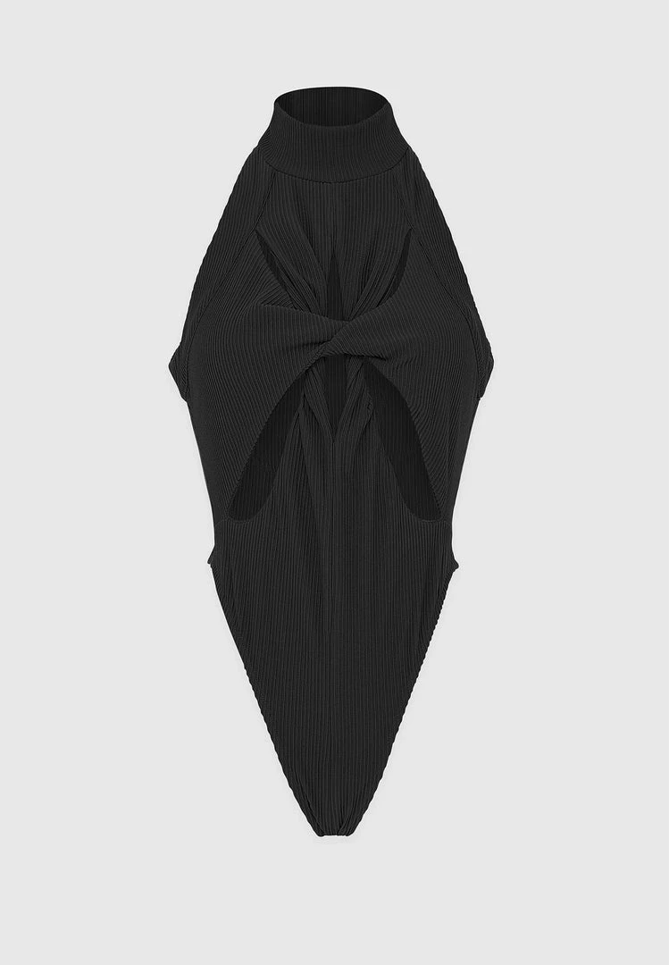 This bodysuit features carefully place cut-outs and twisted detailing to compliment your chest. The high neck accentuates your shoulders for a flattering physique. Wear with jeans or high waisted trousers for the perfect day to night staple.