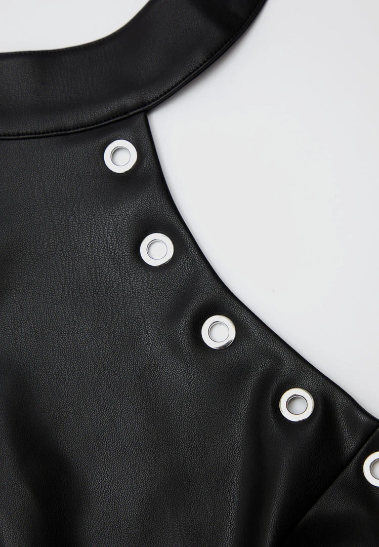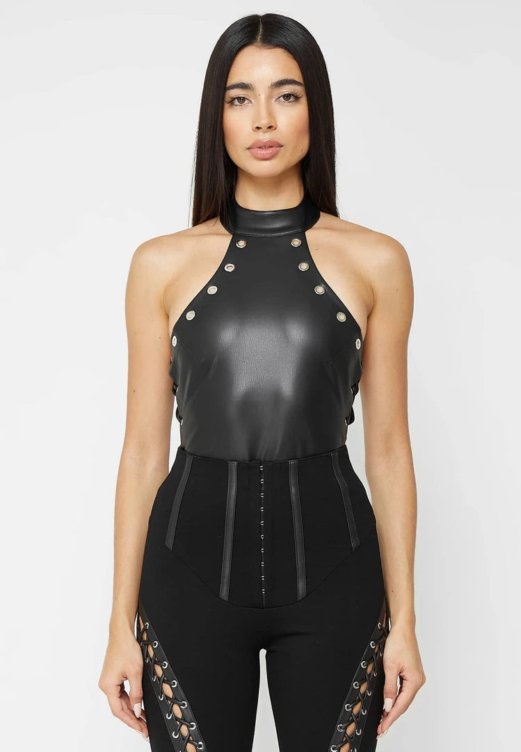 Black Vegan Leather Lace Up Halterneck Bodysuit
