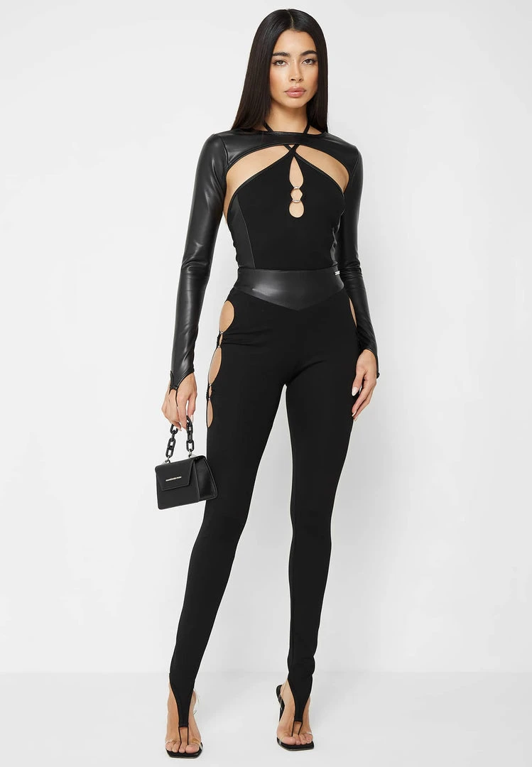 This sultry bodysuit is perfect for evenings out. The vegan leather overlay can be removed to suit your desired look. The vegan leather panels give the illusion of a cinched waist.