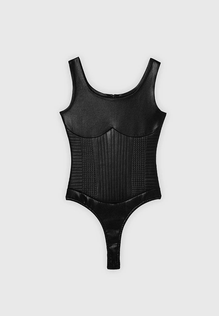 This bodysuit features our custom made corset mould from a vegan leather coating on a sculpting neoprene base. This sports a silver branded plaque for a clean and minimal finish.