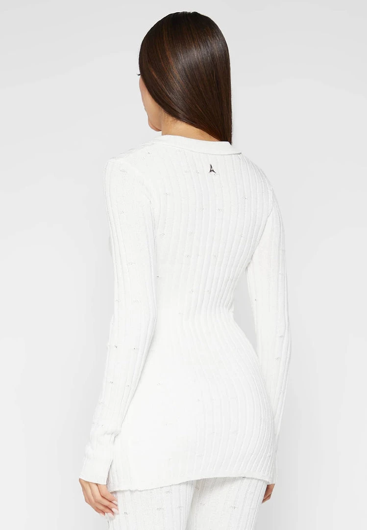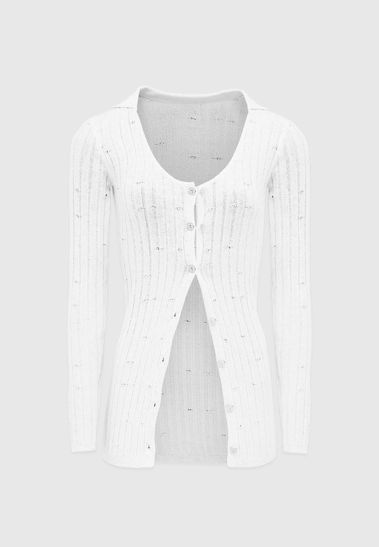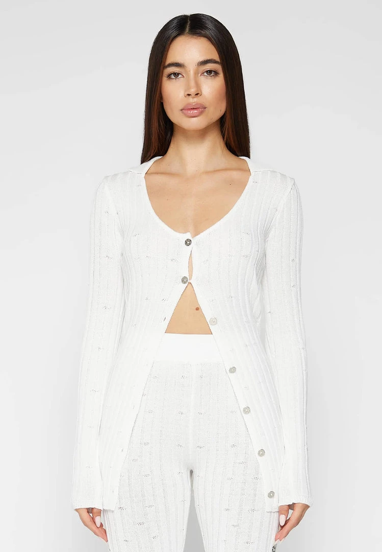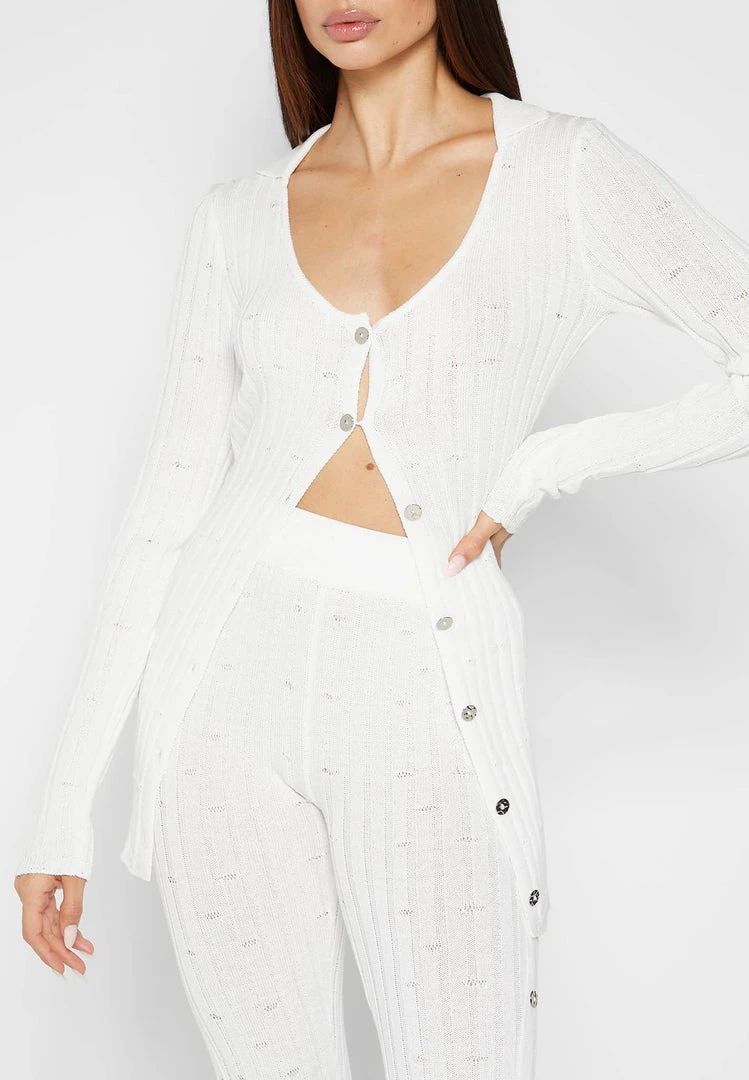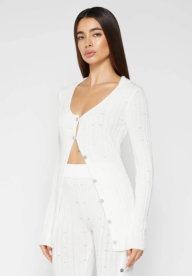 This cardigan features a longline hem that drapes perfectly over the hips. The distressing and hammered buttons add a casual aspect to the cardigan making this perfect for day to night occasions when styled with heels.