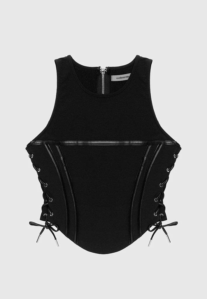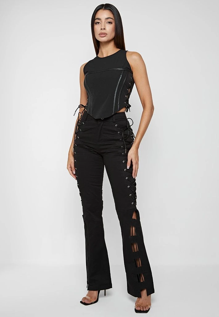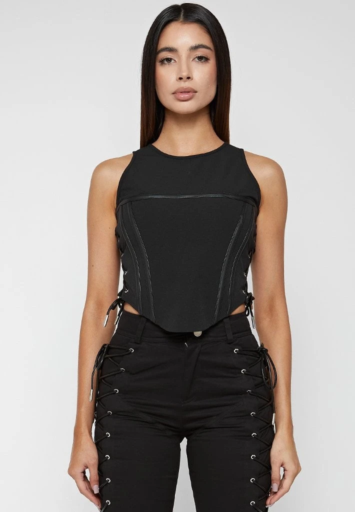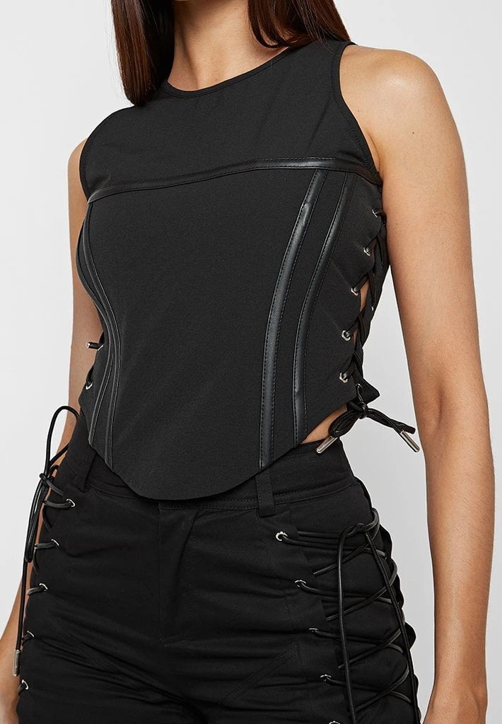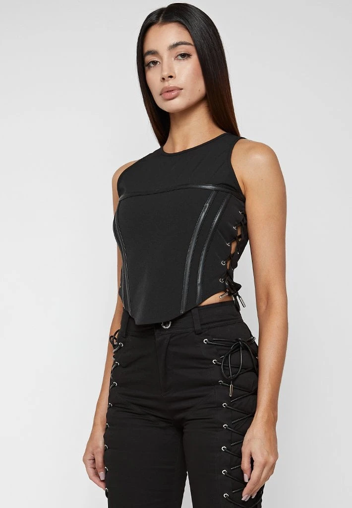 This corset top features vegan leather wrapped boning for a snug fit to contour your shape. The lace up at the sides add a sultry feminine touch, making these easy to pair with bottoms for a night out.
