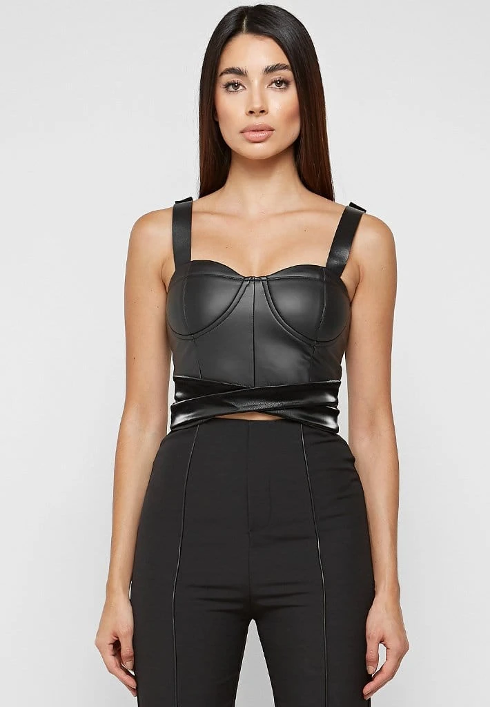 Black Matte Vegan Leather Crossover Bustier Top