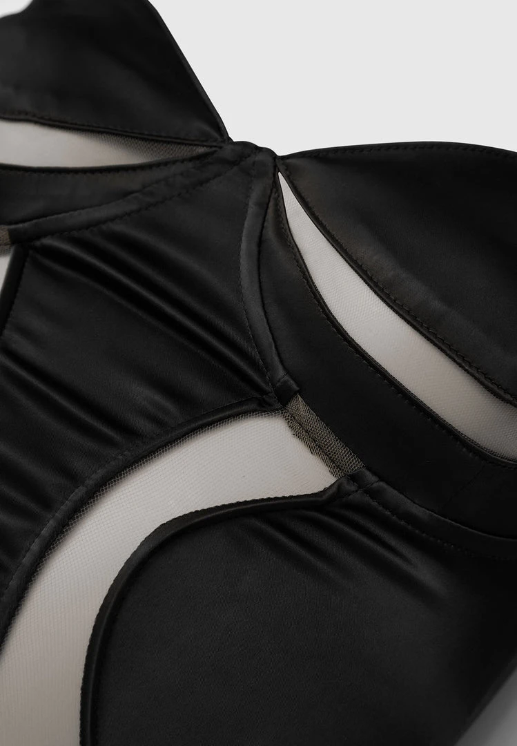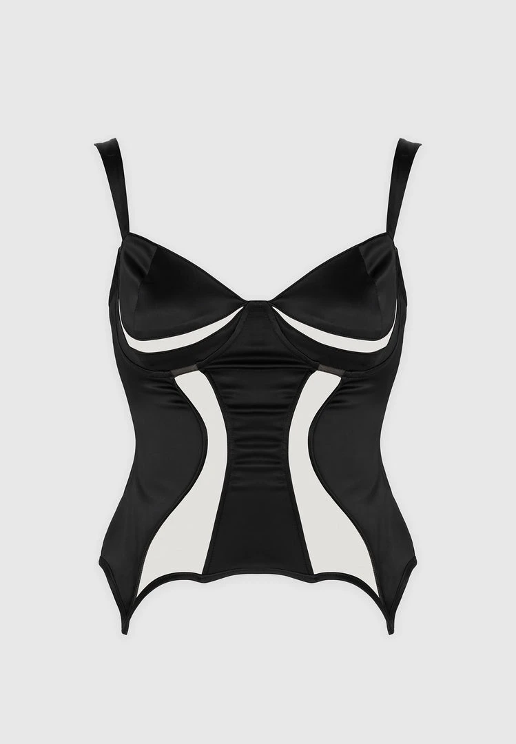 The carefully placed mesh contouring and the internal boning create the illusion of a cinched waist and ensures that the shape is remains structured.