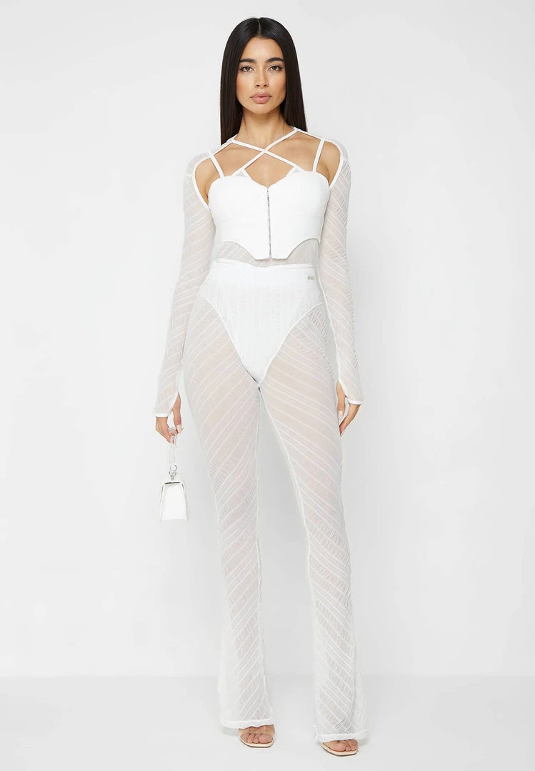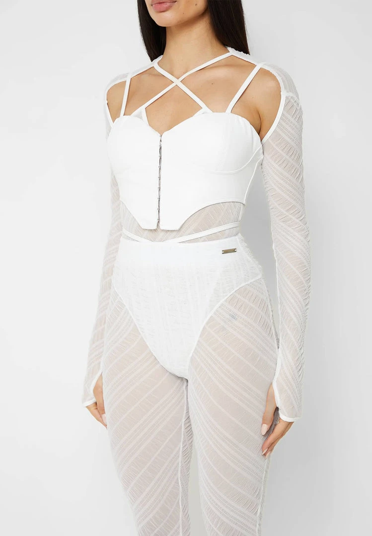 This bodysuit features a detached vegan leather corset that can be worn on its own and styled as desired or worn with the sheer bodysuit for a sexy evening look.