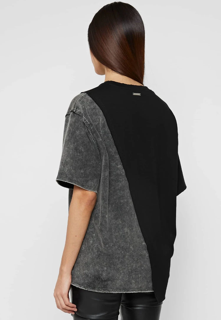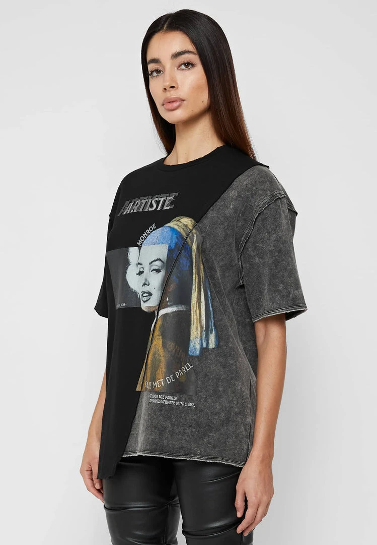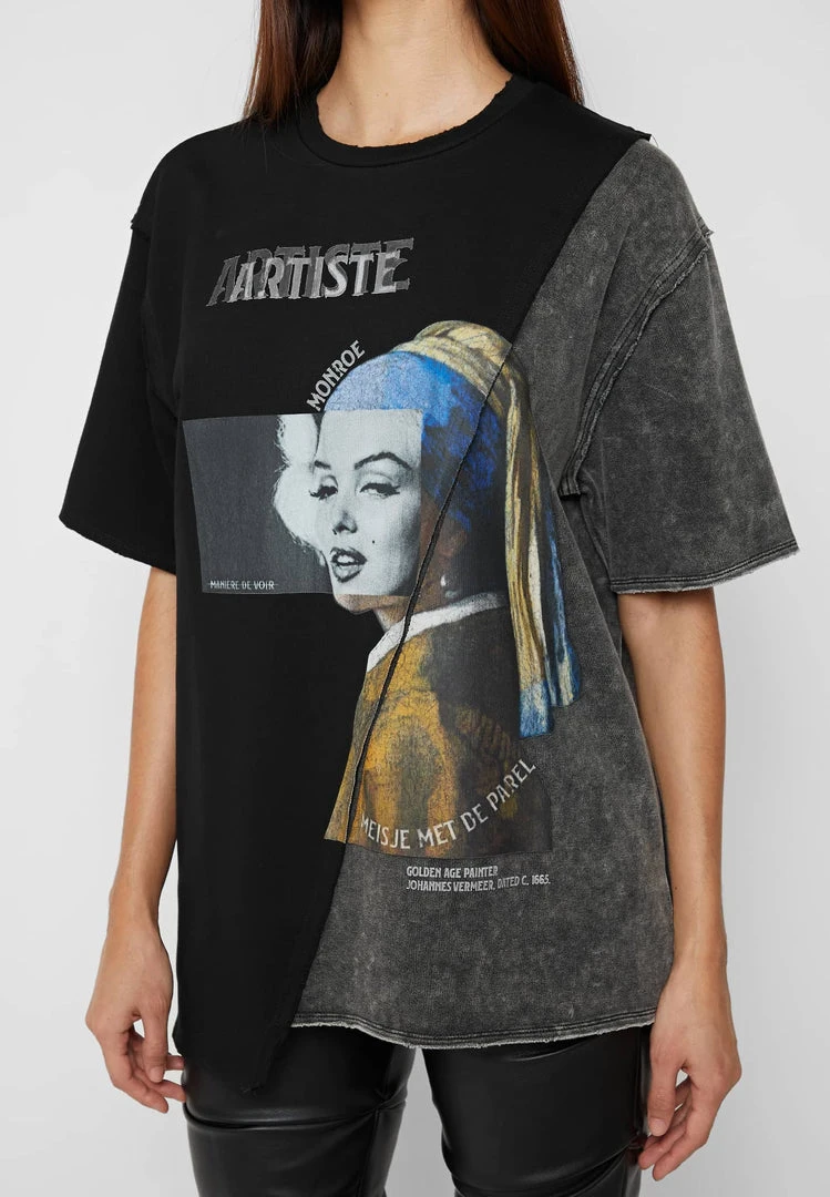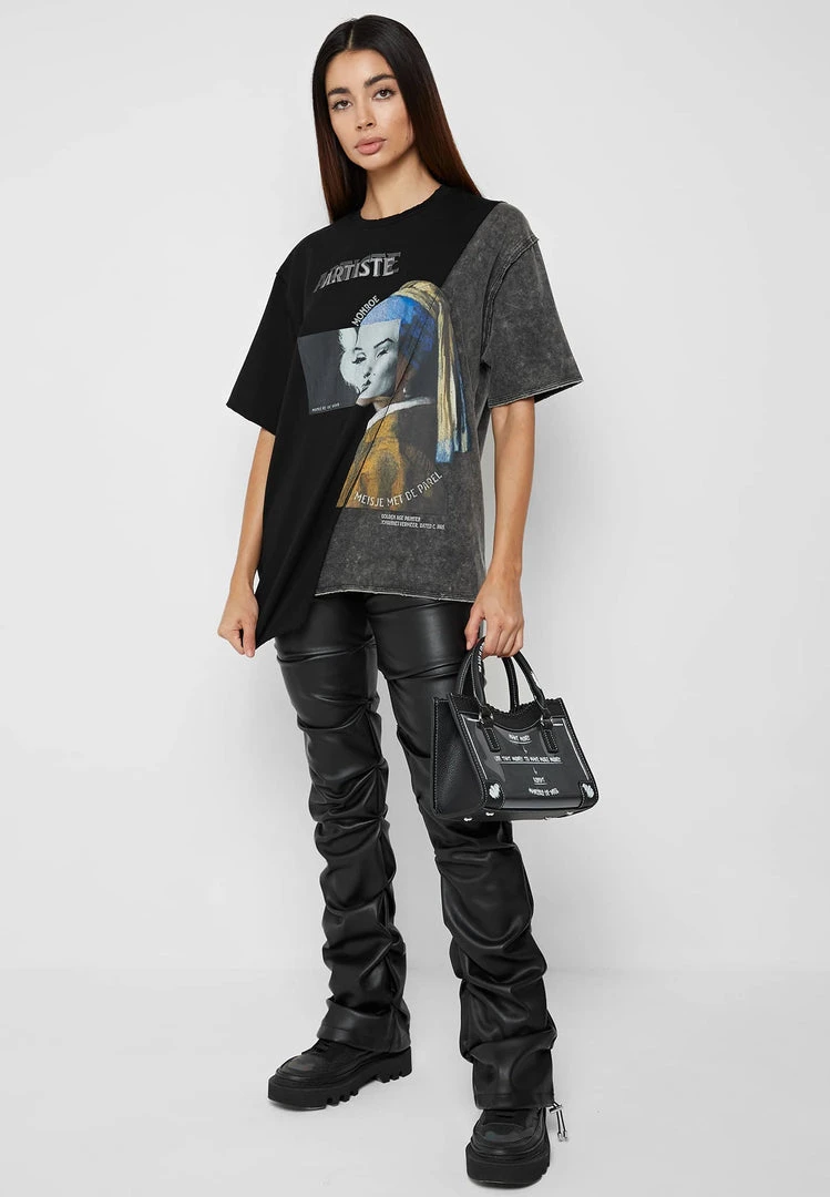 Inspired by the 1966 “Girl with the Pearl Earring” painting by Vermeer, this graphic T shirt brings a street twist on the classic painting. This is an oversized fit with true distressing detail and a split washed fabric.
