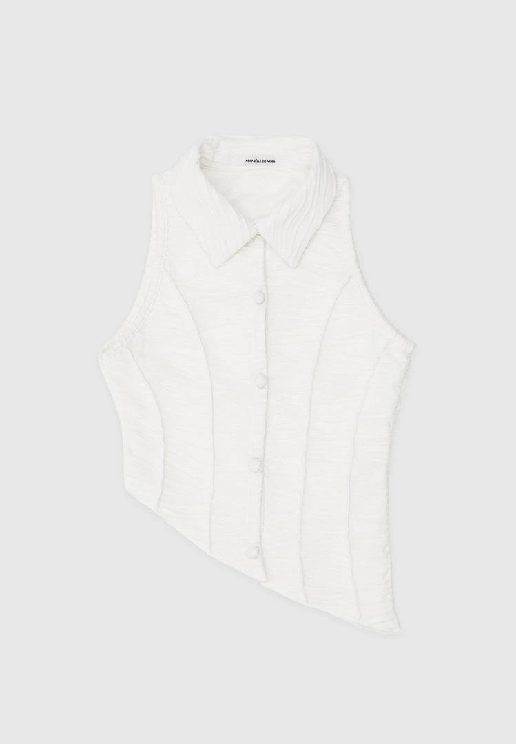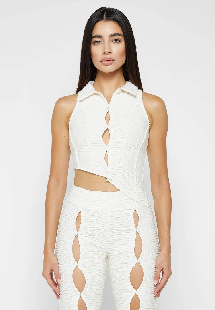 Featuring an asymmetric lettuce finished hem, this top carries the lettuce detailing throughout on top of a sheer mesh overlay. The collar mixed with the subtle contour detailing provides the perfect smart going out look when paired with the matching trousers.