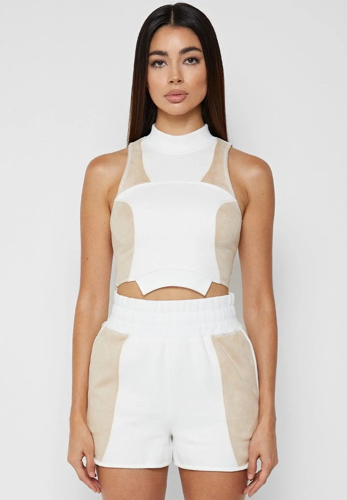 An elevated take on an athleisure look with contrast suede panelling that contours the body. The extended asymmetric fine rib hem is an additional detail to finish the look.