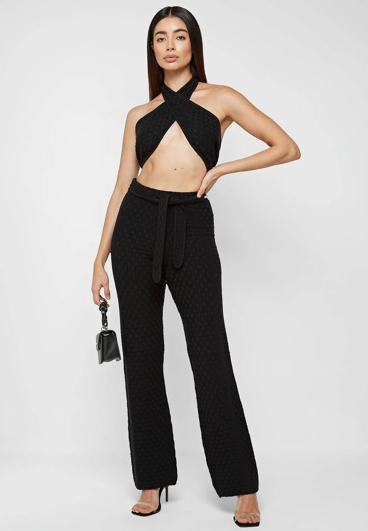 A multiway stretch knit crossover top with a silver branded plaque to keep the clean, minimal aesthetic.