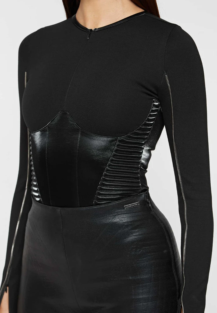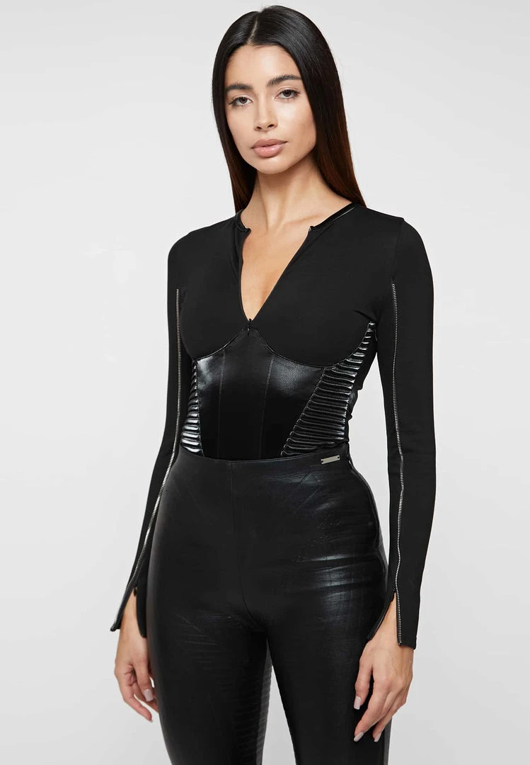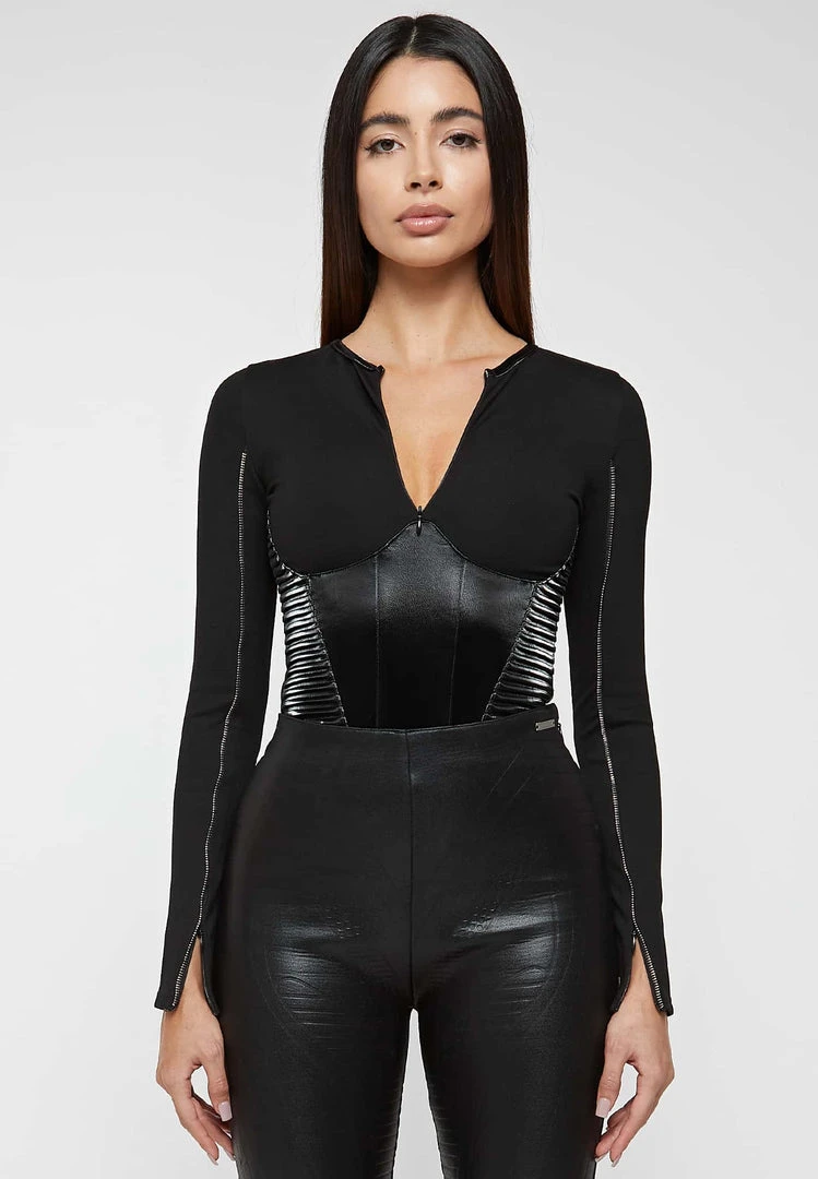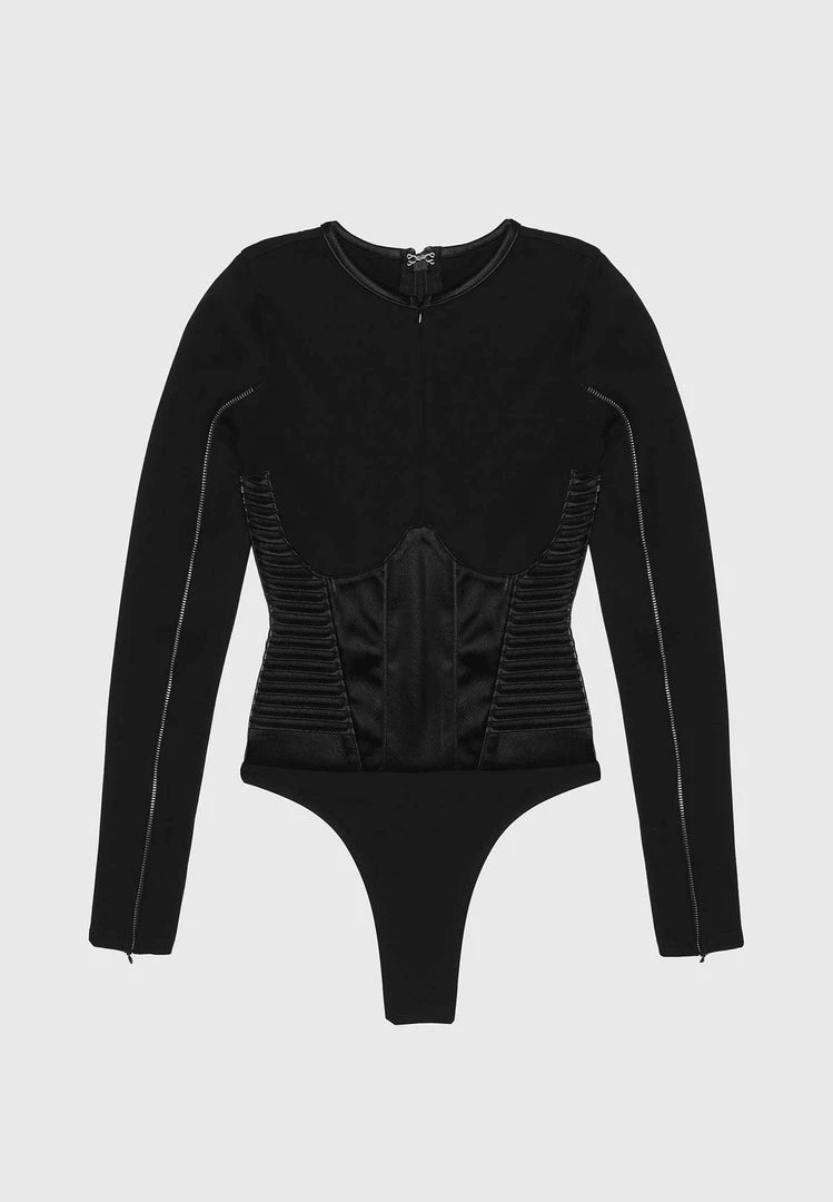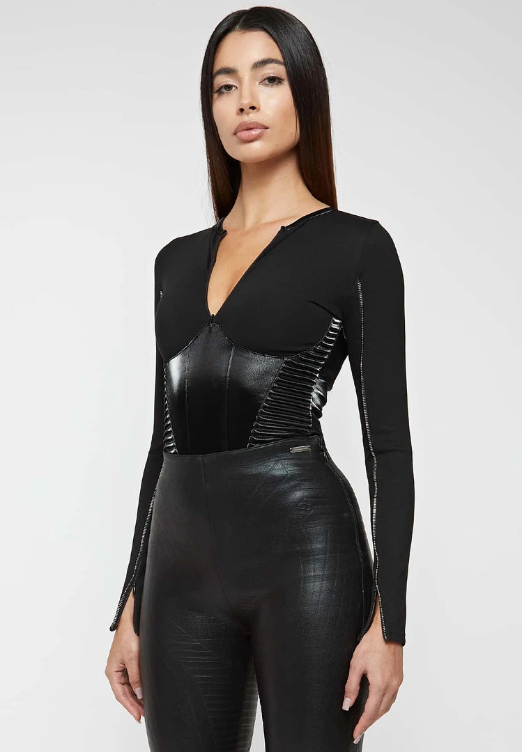 With a sheen textured corset, this bodysuit cinches and flatters all silhouettes. The corset also features ribbing detail and paired with our signature bandage fabric base, this bodysuit is the perfect statement piece on any night out.