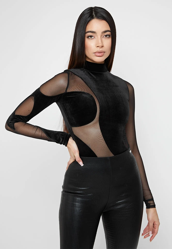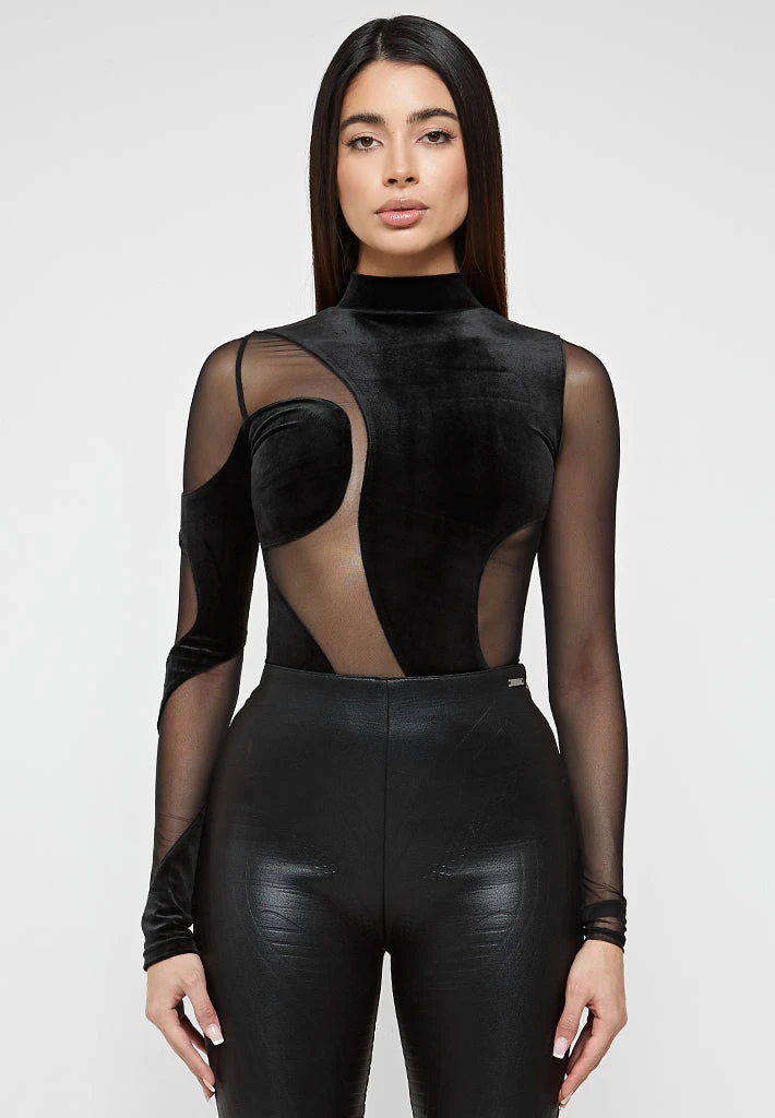 For a top that makes a statement, the thoughtfully placed velour against the next to skin fine mesh – uniquely contours and flatters your figure.