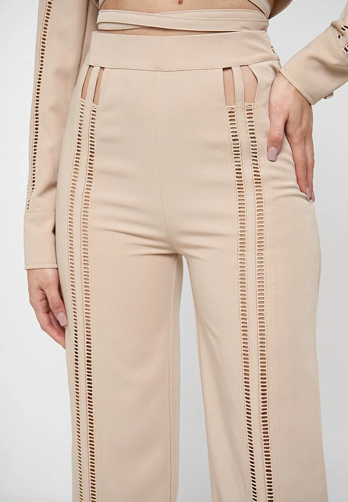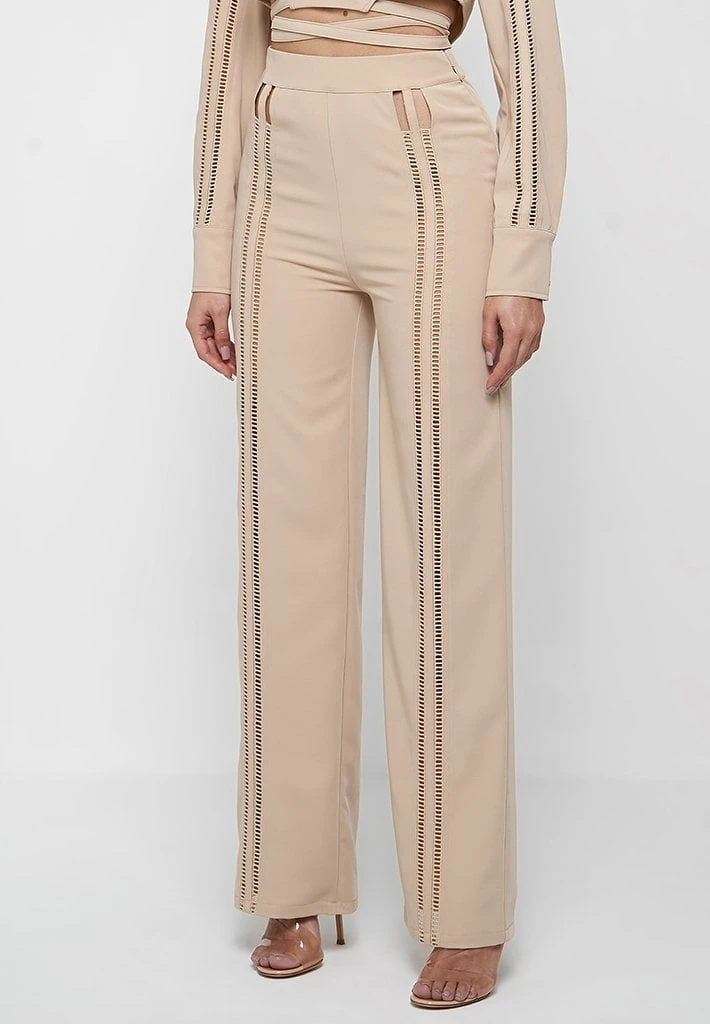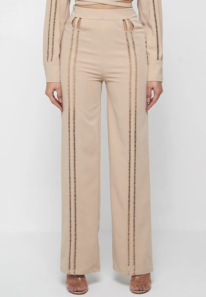 This co-ord features ladder detailing for a unique touch. With wrap around ties, two tone buttons and cut outs – this lightweight set is great for a night out.
