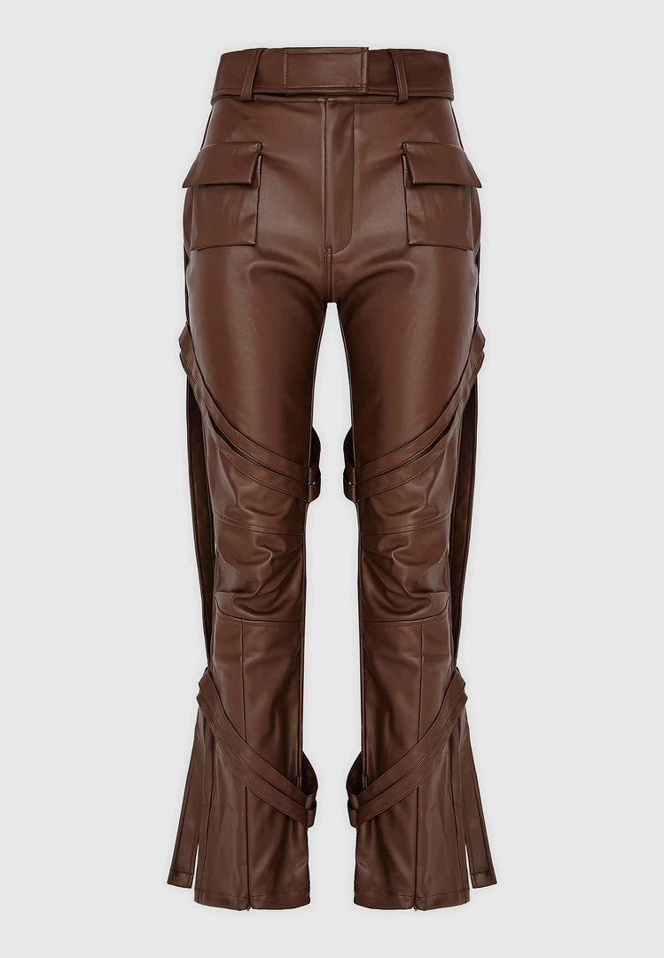 The Vegan Leather Carpenter Cargo Trousers have a casual feel thanks to the sizeable cargo pockets, but are designed with just as much consideration as a going out style. Made from vegan leather with a straight leg, deep waistband and carpenter belt detailing. The invisible zips at hem can be used for versatile styling for both casual and dressy looks.